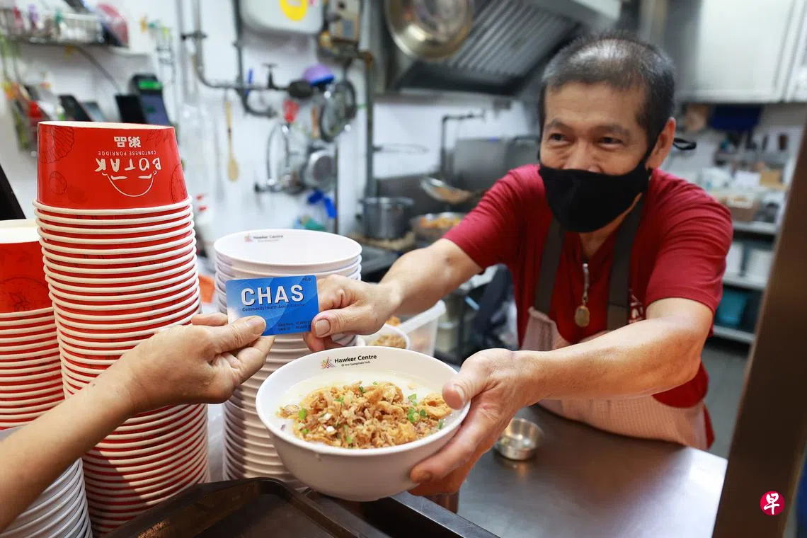 这两家摊位分别在淡滨尼天地小贩中心与榜鹅综合社区小贩中心。橙色和蓝色CHAS卡持有者仅需出示有效期内的卡,即可兑换4元以下的粥品,每人每日限兑一碗粥,而且仅限堂食。