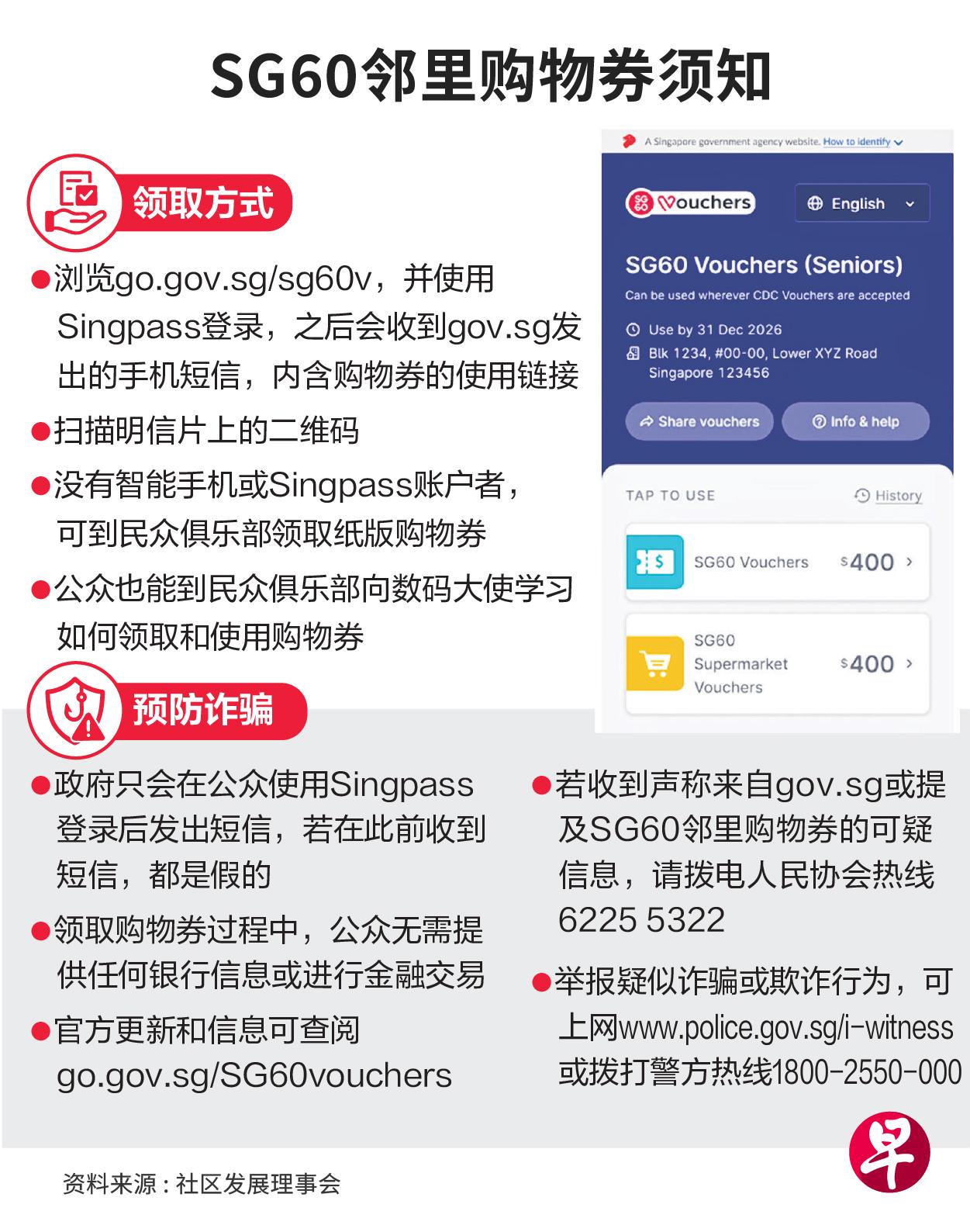 SG60邻里购物券的领取和使用方式与社理会邻里购物券相同;公众只须上网go.gov.sg/sg60v,用Singpass登录,便会收到含购物券使用链接的gov.sg短信。