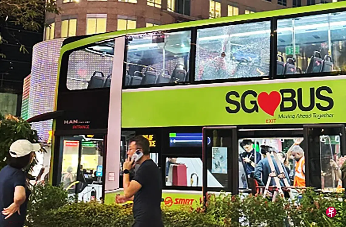 一辆SMRT营运的双层巴士在乌节路发生事故,巴士上层车窗玻璃疑遭人抛掷瓶子,导致玻璃破裂出现一个拳头般大小的破洞,整面呈蜘蛛网状,一人受伤送院。