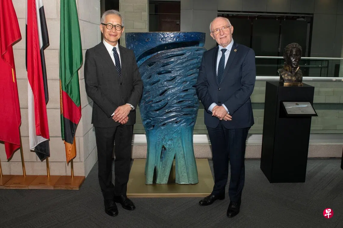 新加坡民航局主席郑维荣和局长韩国元星期五(7月4日)在国际民航组织于加拿大蒙特利尔总部,将雕塑交给国际民航组织理事会主席夏基塔诺(Salvatore Sciacchitano)。