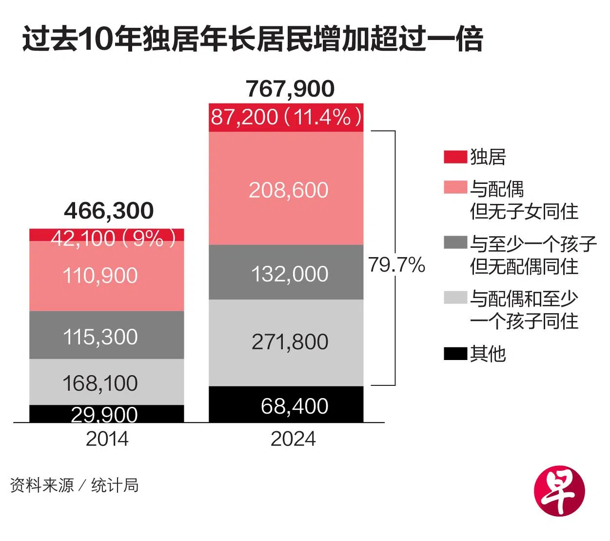 根据社会及家庭发展部星期一(7月7日)发布的2025年《家庭趋势报告》,去年的独居年长居民人数,对比2014年的4万2100人,增加超过一倍。