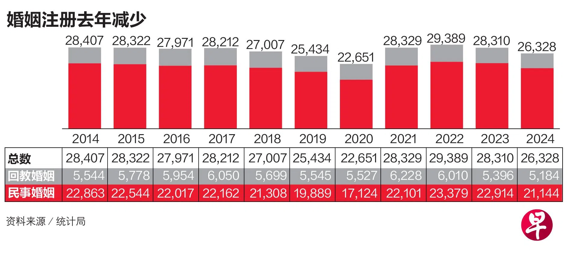 另据新加坡统计局的数据,本地男女去年整体结婚率相比10年前有所下降。每1000名15岁至49岁的未婚男性当中,2024年有42人结婚,比2014年的44.4人少。未婚女性的情况也相似,每1000名15岁至49岁的未婚女性当中,2024年有40.1人结婚,比10年前的40.8人少。