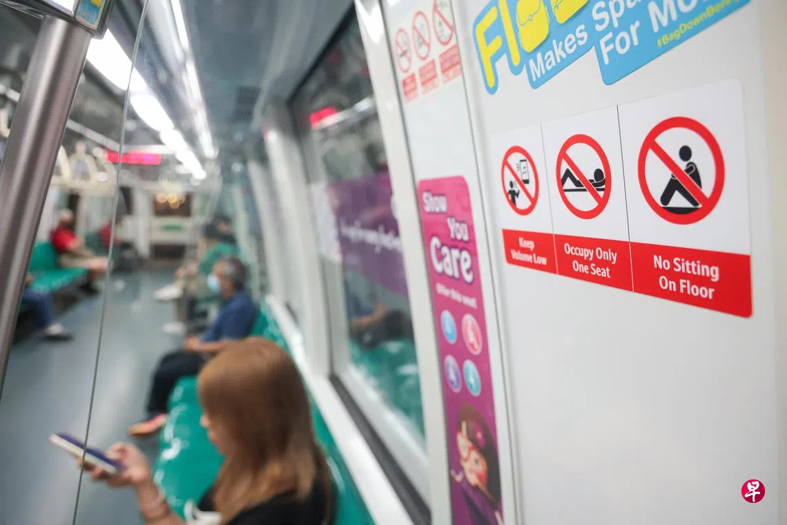 自去年底,陆交局着手在地铁和巴士张贴新标志,包括提醒巴士和地铁乘客使用手机或讲话时要小声,以及不要在列车占用多个座位,或坐在列车地板上,鼓励乘客举止文明,更有公德心,提升搭乘体验。