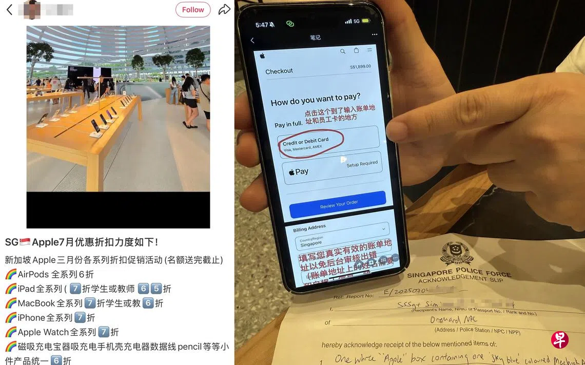 周先生下单后,在7月4日前往乌节路的苹果门店领取电脑,发现单据上注明是原价,并非对方声称的员工价,让他起了疑心。