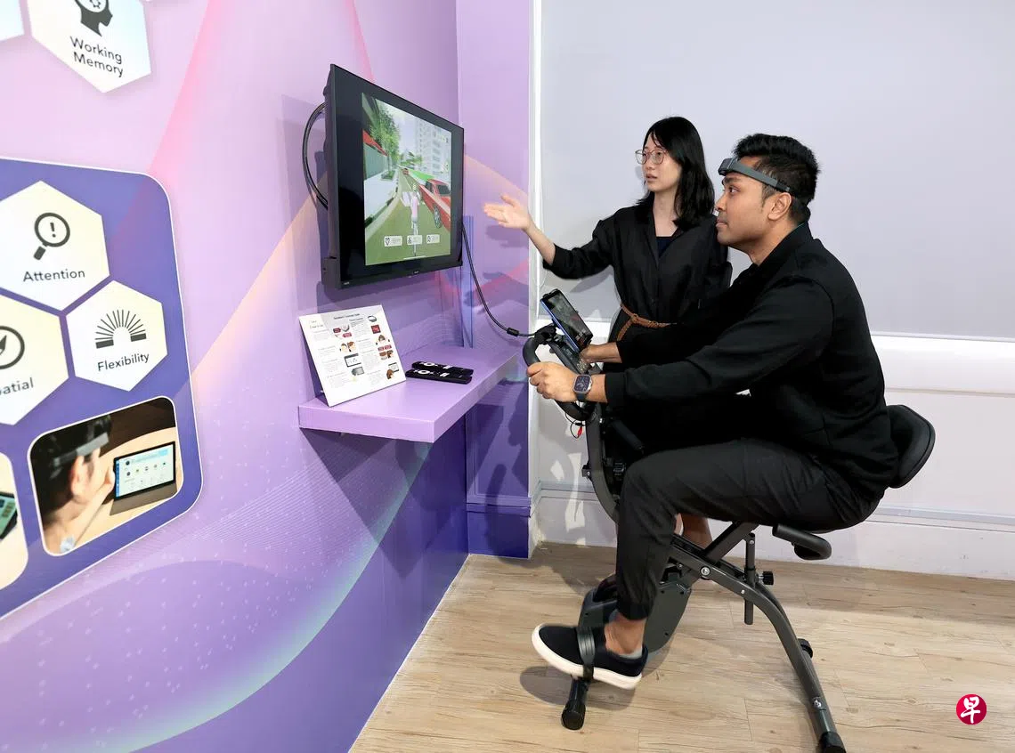 另一个是本地公司Neeuro研发的脑机接口(Brain-Computer Interface)技术。公众可戴上感应头带,骑上结合这项技术的脚踏车,在虚拟道路上边骑行边完成任务,同时锻炼大脑与身体。