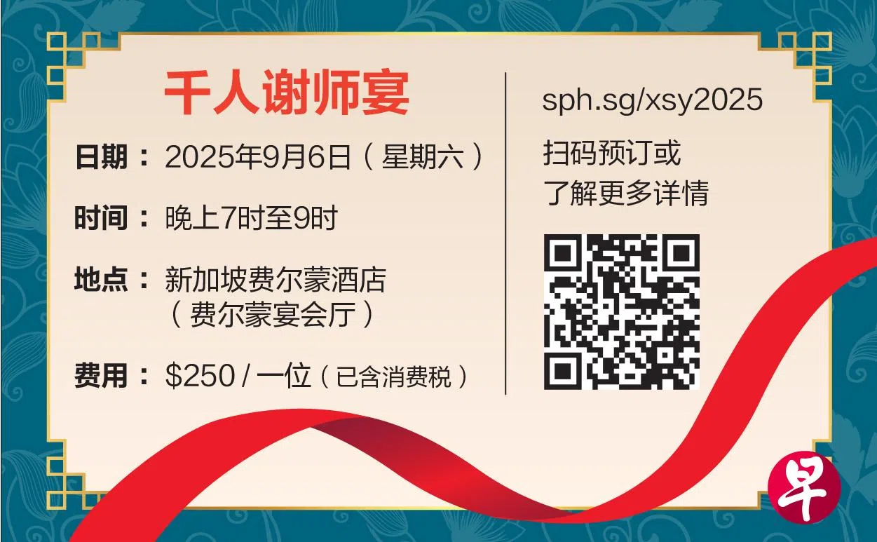 晚宴单座位的售价是250元,10人一桌的售价为2500元,价钱包含消费税。感兴趣的公众可登录sph.sg/xsy2025或扫描QR码预订,以及了解更多详情。订桌和单买席位的截止日期是8月10日(星期天)或售罄为止。