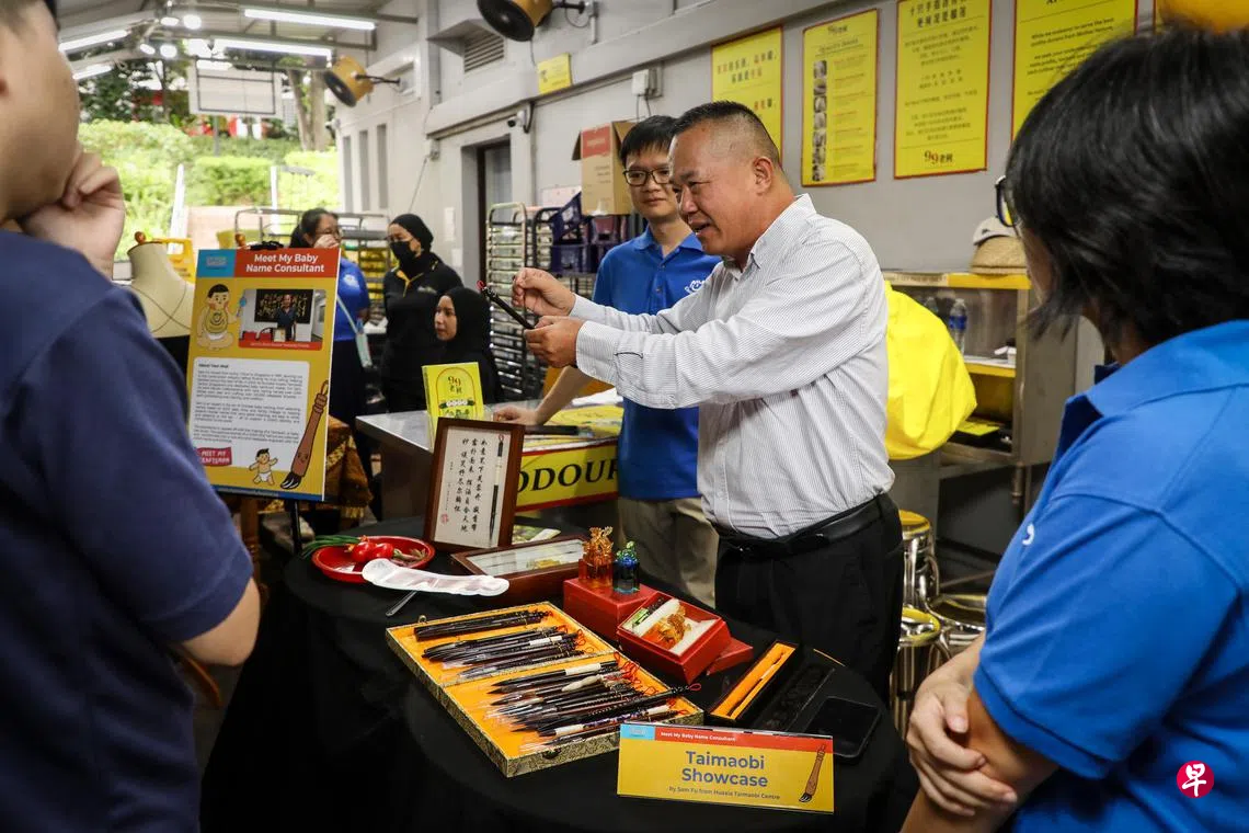 华夏胎毛笔创办人傅森将介绍华族根据生辰或族谱辈分为新生儿取名的传统,以及用新生儿初生毛发制作胎毛笔作纪念的手工艺等。
