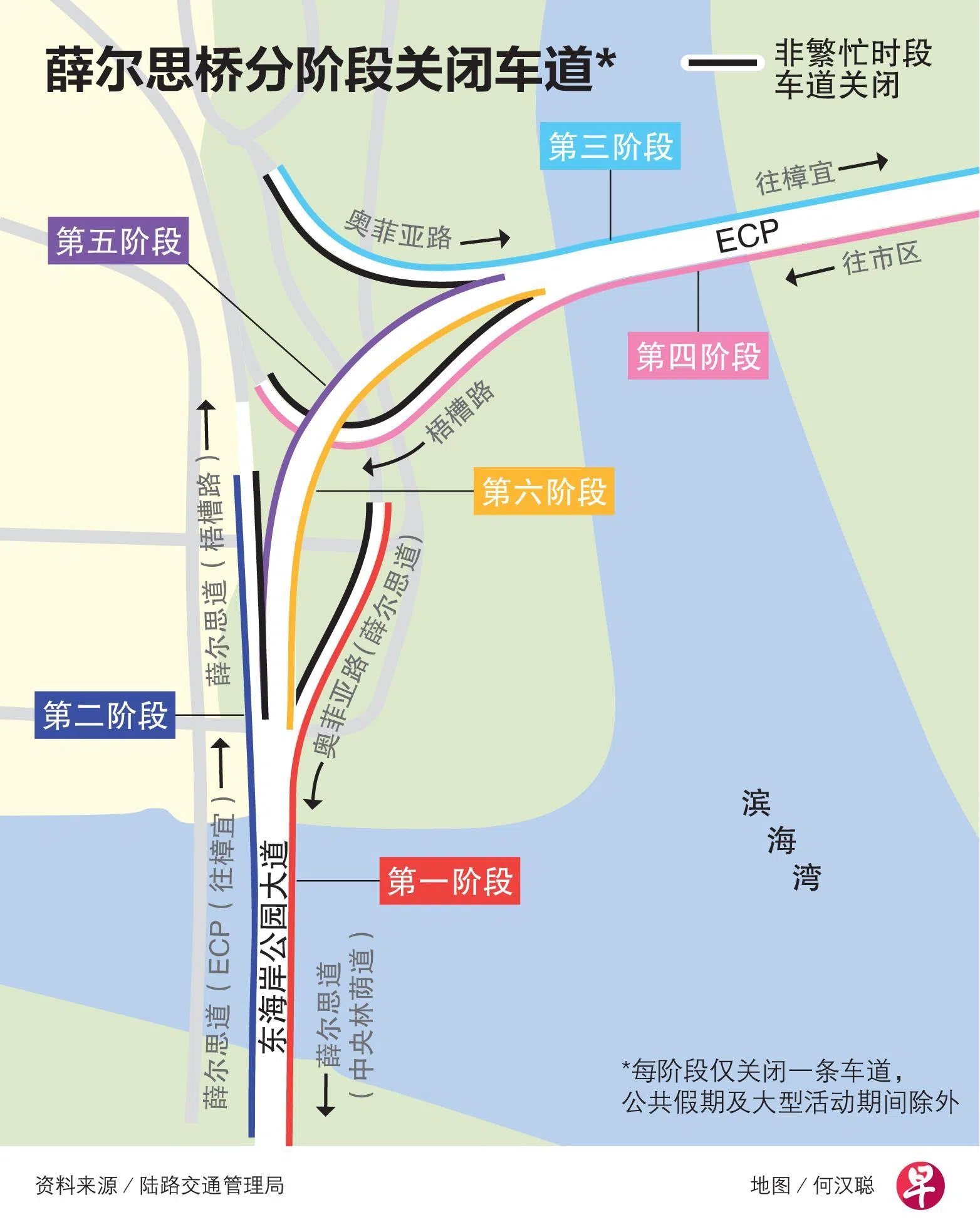 为尽量减少对交通的影响,工程将分六个阶段进行,每个阶段只会关闭一条车道。当局也不会在公共假期、世界一级方程式(F1)赛车,或者国庆庆典等重大活动期间封路。