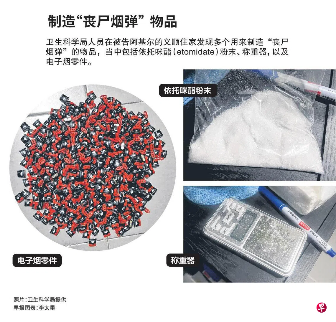 卫生科学局指出,这是当局首次提控涉及在住家制造含有依托咪酯(etomidate)的电子烟(俗称“丧尸烟弹”),意图用于贩卖的涉案者。