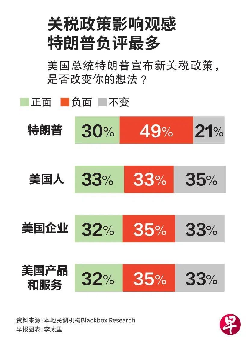 本地民调机构Blackbox Research发布的第二季“SensingSG”调查指出,49%新加坡人因关税政策对特朗普印象转坏,仅30%表示好感提升。与此同时,35%受访者对美国企业及产品和服务评价下滑。