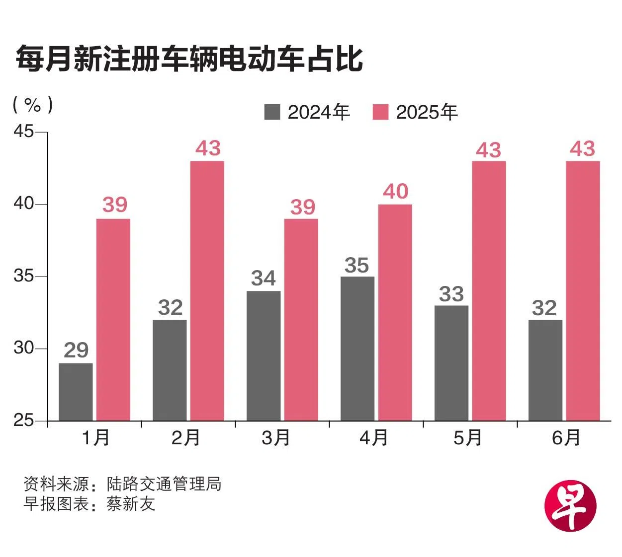 今年上半年的每月新注册车辆中,电动车的占比介于39%至43%,高于去年同期的29%至35%。根据陆交局网站数据,截至6月底,本地共有3万6023辆电动车,单是6月的新注册电动车共计1985辆。