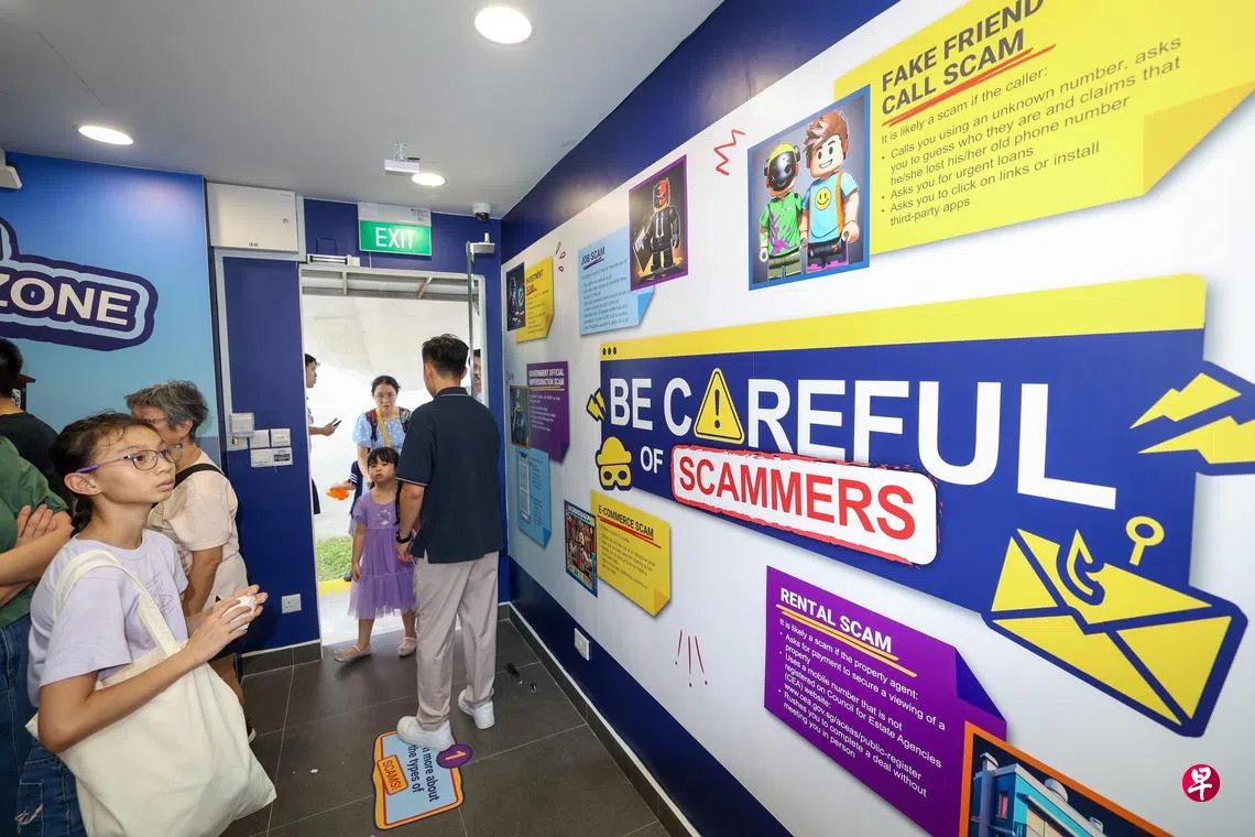 在实龙岗花园邻里警岗的这个展览是第一个,每天早上8时至晚上10时开放。展览分为四个主要互动区域,包括一个防诈教育展区,展示常见的诈骗类型与最新趋势,以及一个结合反诈教育内容的互动迷宫桌游。