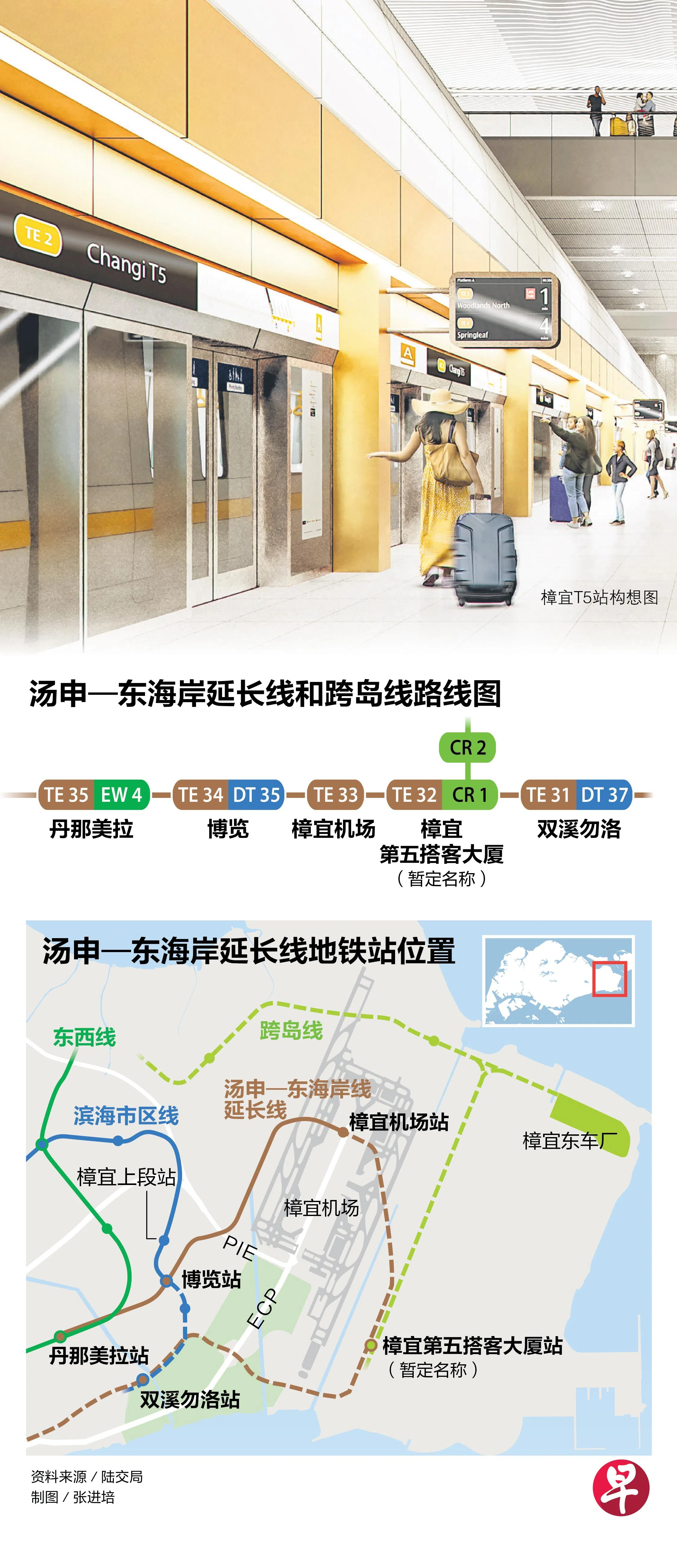 陆路交通管理局星期五(7月25日)发文告宣布,汤申—东海岸线将建造14公里的延长线(TELe),由双溪勿洛站衔接到新的樟宜第五搭客大厦(Changi Terminal 5,简称樟宜T5)转换站,再通往樟宜机场站、博览站和丹那美拉站。