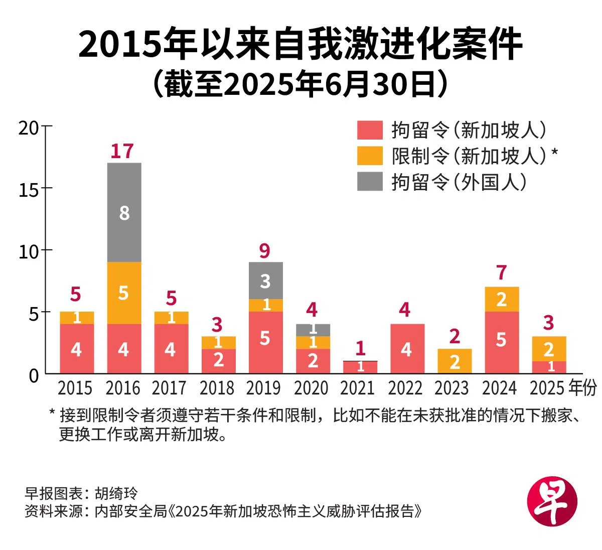 网络平台加速自我激进化过程,当局在《内部安全法令》下处理的案件中,涉案者从首次接触恐怖主义和激进分子,到最终接受暴力极端主义思想的过程时间,从2015年之前的平均24个月,缩短到2021年至2025年的平均12个月。