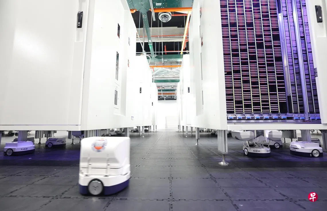 较小的机器人接到派发任务后,会运行到指定柜子下方,等待里头的机械手臂提取相关证件,再运到自助领取机或人工柜台。这些机器人利用人工智能规划路线,也装载传感器避免碰撞。