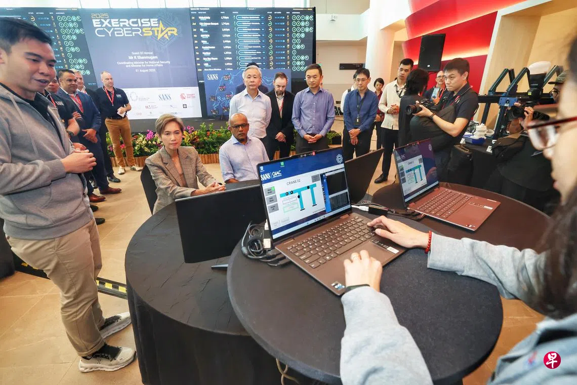 网安局国家网络事故应变中心向尚穆根及数码发展与新闻部长杨莉明演示了我国港口遭网络攻击后,起重机作业瘫痪、能源供应受影响的情境。杨莉明也是主管智慧国与网络安全事务的部长。