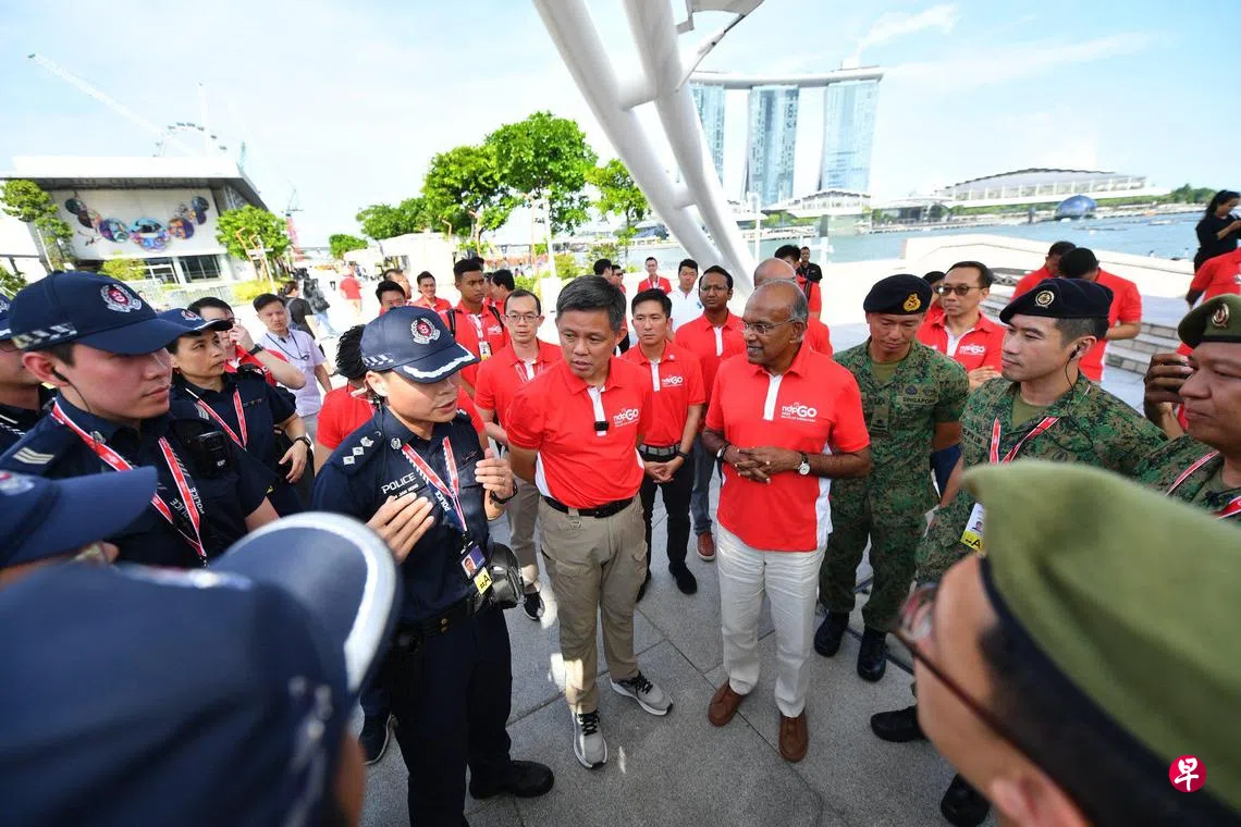 国防部星期六晚上在脸书贴文说,尚穆根和陈振声当天早些时候视察了国庆庆典的相关安保措施,当中包括在国庆庆典会场部署的反无人机系统(C-UAS)。根据国防部上载的照片,两名部长也与负责滨海湾一带人群管理行动的新加坡武装部队和新加坡警察部队人员交流。