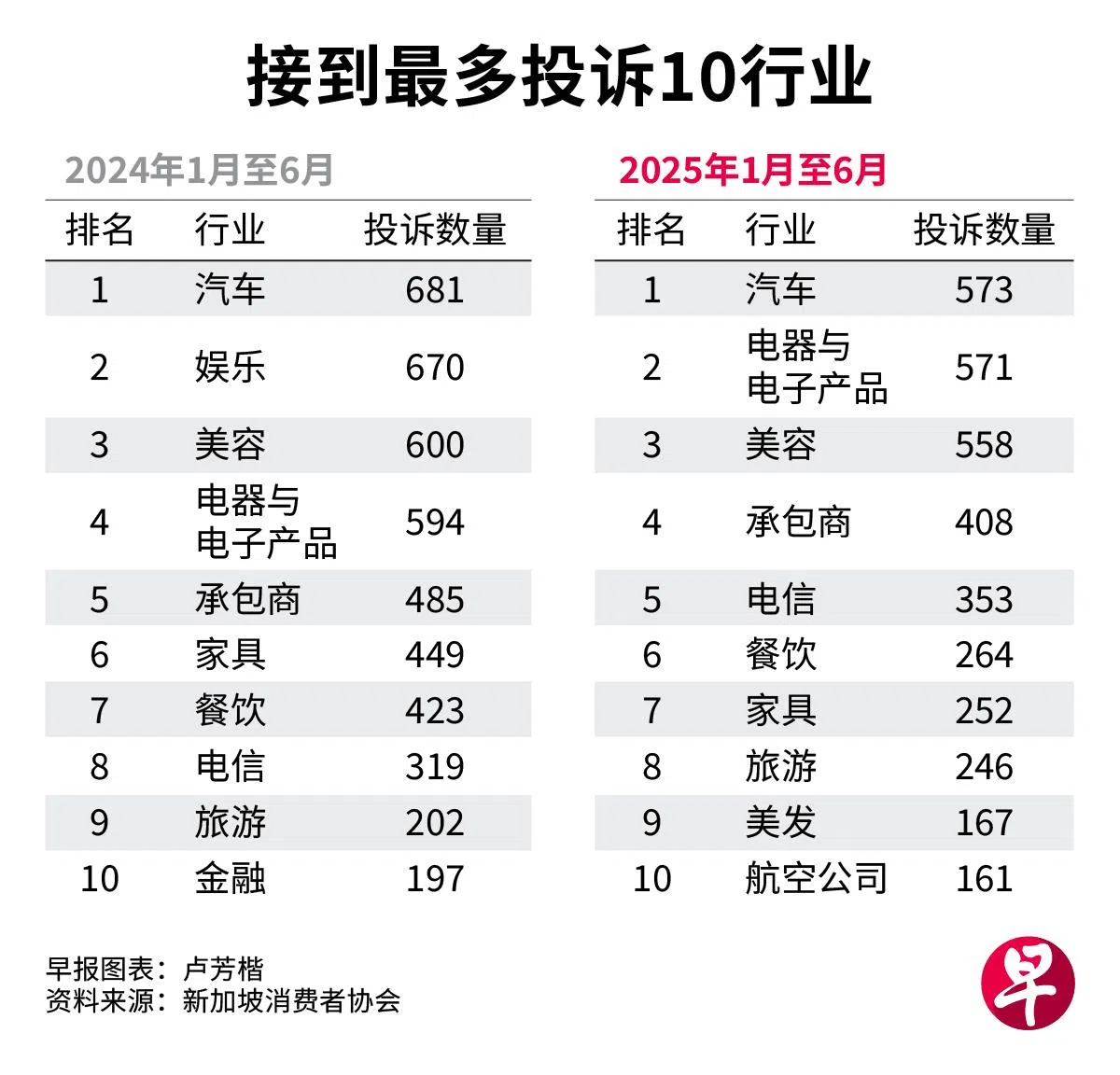 今年投诉量最高的五个行业依序是:汽车、电器与电子产品、美容、装修承包商,以及电信业。