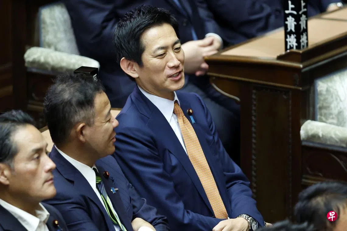 小林鹰之(右一)应外交部长维文医生之邀,在纳丹访问学者计划下来访我国。图为小林鹰之8月1日在东京出席日本众议院临时会议。 (彭博社)