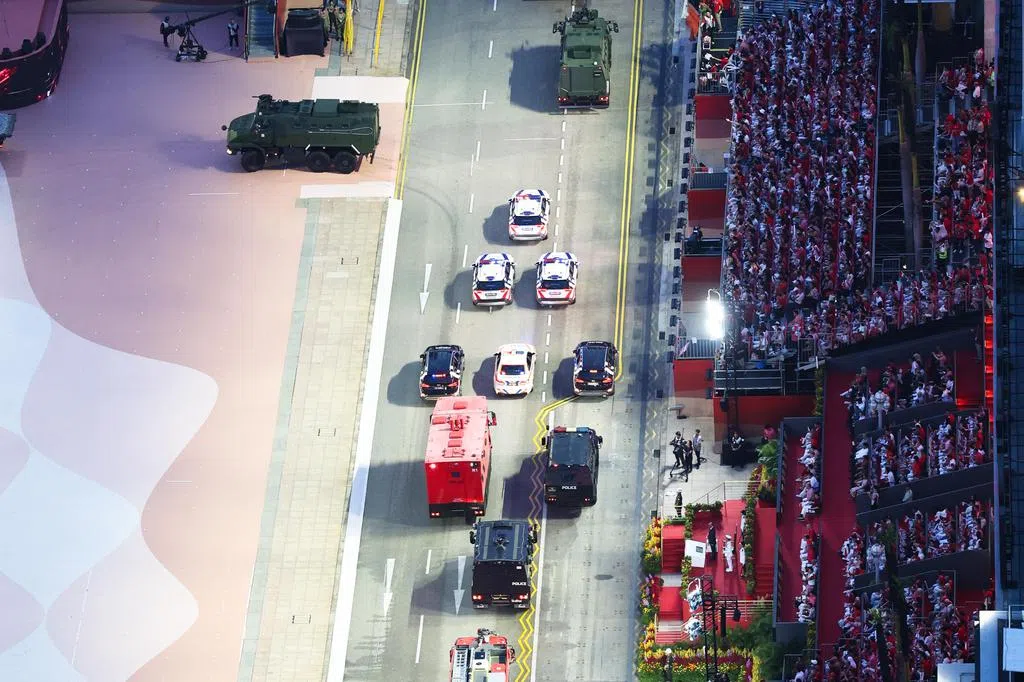 从星期天(8月10日)中午时分起,60辆武装部队、民防部队和警察部队的车辆从F1维修大楼出发,兵分五路开向全岛东南西北五个邻里。每个小队都会在途中停靠一次,让附近的公众有机会近距离参观、留影。
