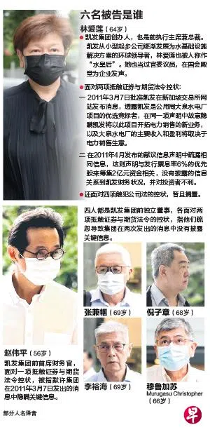 掌舵凯发时期有“水皇后”之称的林爱莲(64岁)、凯发前首席财务官赵伟平(56岁),以及四名前独立董事张兼帼(69岁)、倪子章(68岁)、李裕海(69岁)和穆鲁加苏(Murugasu Christopher,66岁),星期一(8月11日)起在国家法院受审。六人被指抵触证券与期货法令,控状内容涉及凯发两次就大泉项目发表公开声明时,隐瞒水电厂得靠卖电来赚钱的关键信息。