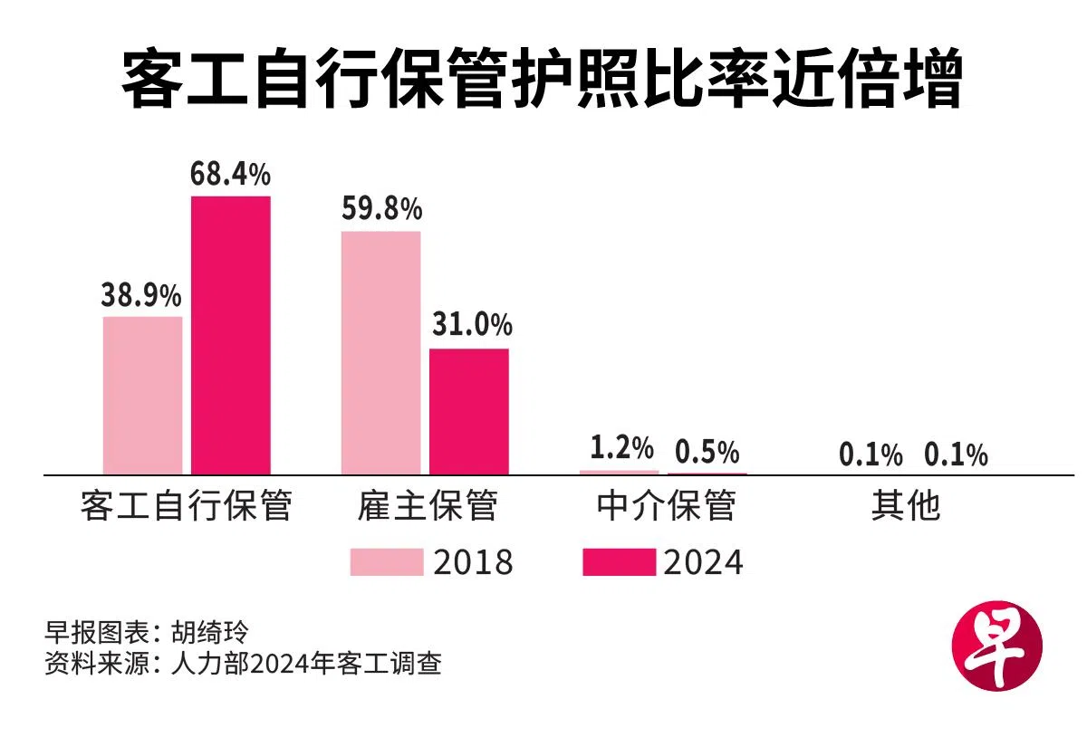 调查显示,越来越多客工可自行保管护照,从2018年的38.9%增至2024年的68.4%,由雇主代管的比率从59.8%大降至31.0%。