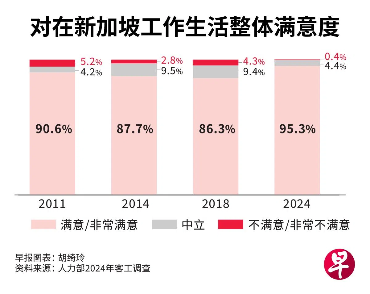 人力部星期四(8月21日)公布的2024年客工调查(Migrant Worker Experience Survey)数据显示,95.3%的客工对在新加坡工作和生活感到满意,和上次2018年调查时的86.3%相比,提高了九个百分点。