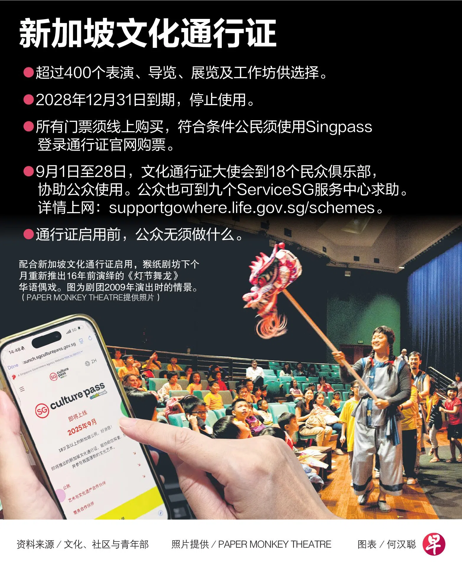 新加坡文化通行证计划9月1日启动,首推超过400个艺术与文化活动,18岁及以上新加坡公民通过Singpass登录官网,便可使用通行证里的100元储值,购票观赏表演或参与各类导览、展览和工作坊。