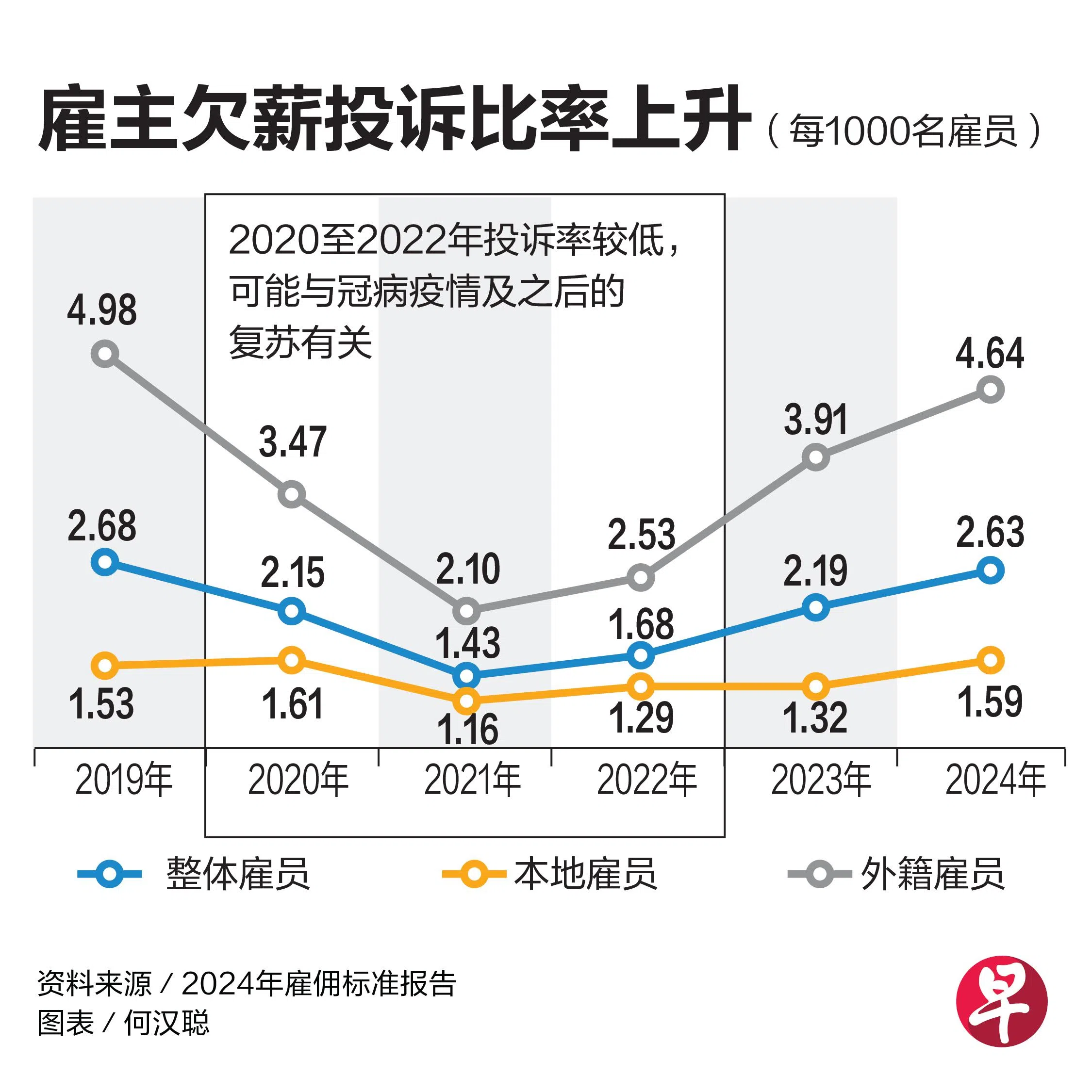 由于近来有更多企业裁员、解聘和倒闭,以及更多雇主因财务困难出现欠薪或延迟发薪,本地雇员的薪资与解雇投诉增加,从2023年每1000人的2.53起,上升至2024年的3.12起,总数近1万2000起,同比增加两成多。