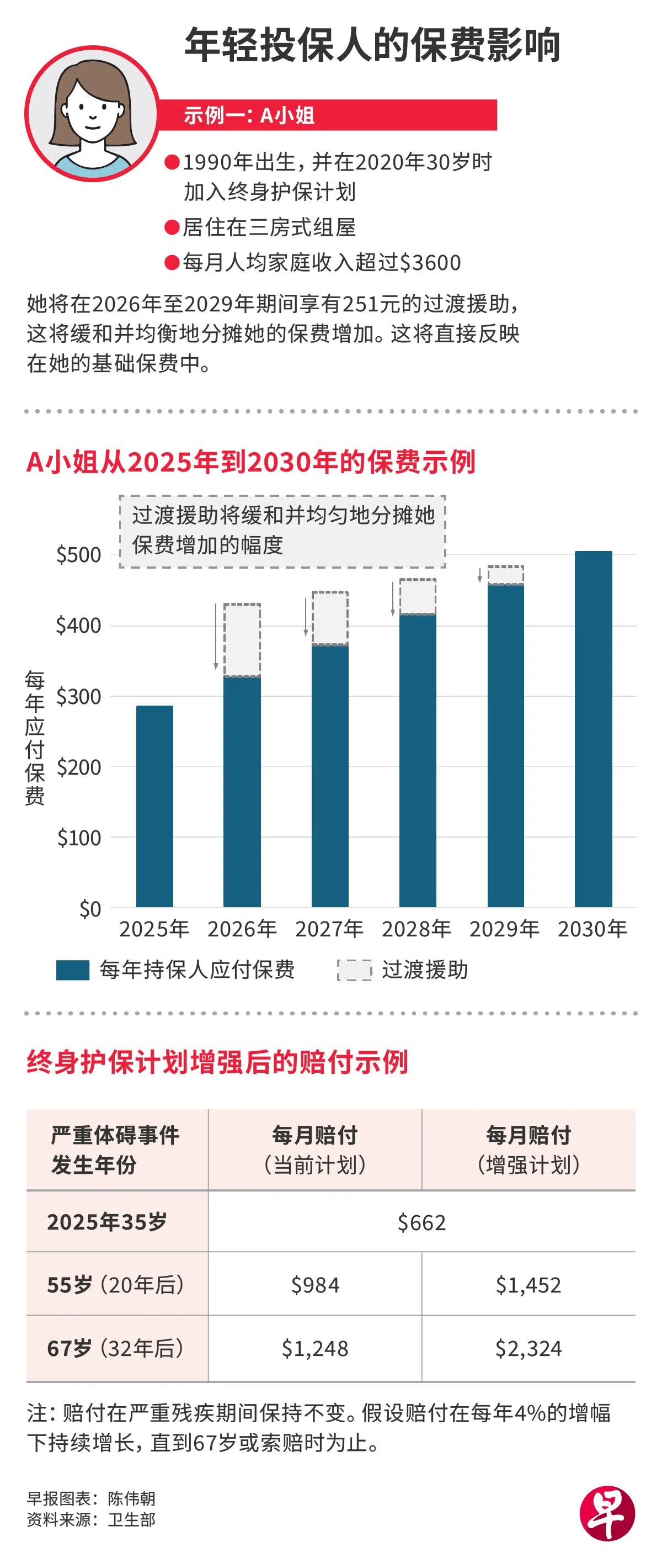 如果没有政府的过渡援助缓冲,终身护保在2026年的年度保费将平均增加126元,并在往后四年逐年增加4%。不过,政府将在未来五年提供超过5亿7000万元的额外津贴,使2026年至2030年的逐年保费增幅,平均控制在38元,最高不超过75元,以缓冲保费上涨幅度,减轻投保人的负担。中低收入的新加坡人也可获更多保费津贴,保费涨幅预计更低。