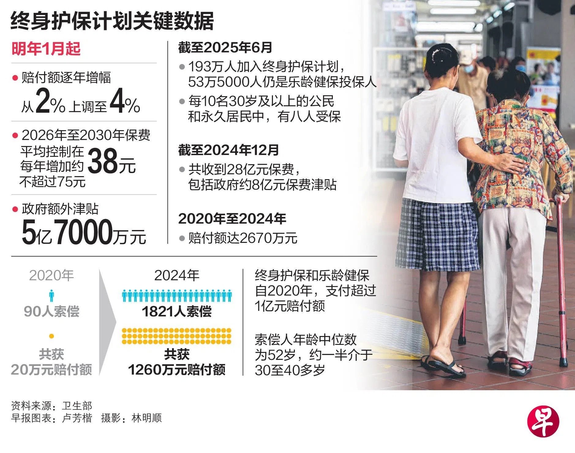 明年起,全国重度残障保险“终身护保计划”(CareShield Life)的赔付额增幅将从原来的每年2%增至4%,以应对不断上涨的长期护理费用。为了维持更高的赔付额增长率,保费也须增加。