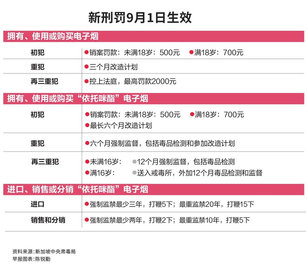 根据新惩处措施,拥有、使用和购买电子烟者,初犯未满18岁罚款500元,满18岁罚款700元,高于现行的300元和500元;重犯者须强制参加三个月的康复计划,或面临更重刑罚。