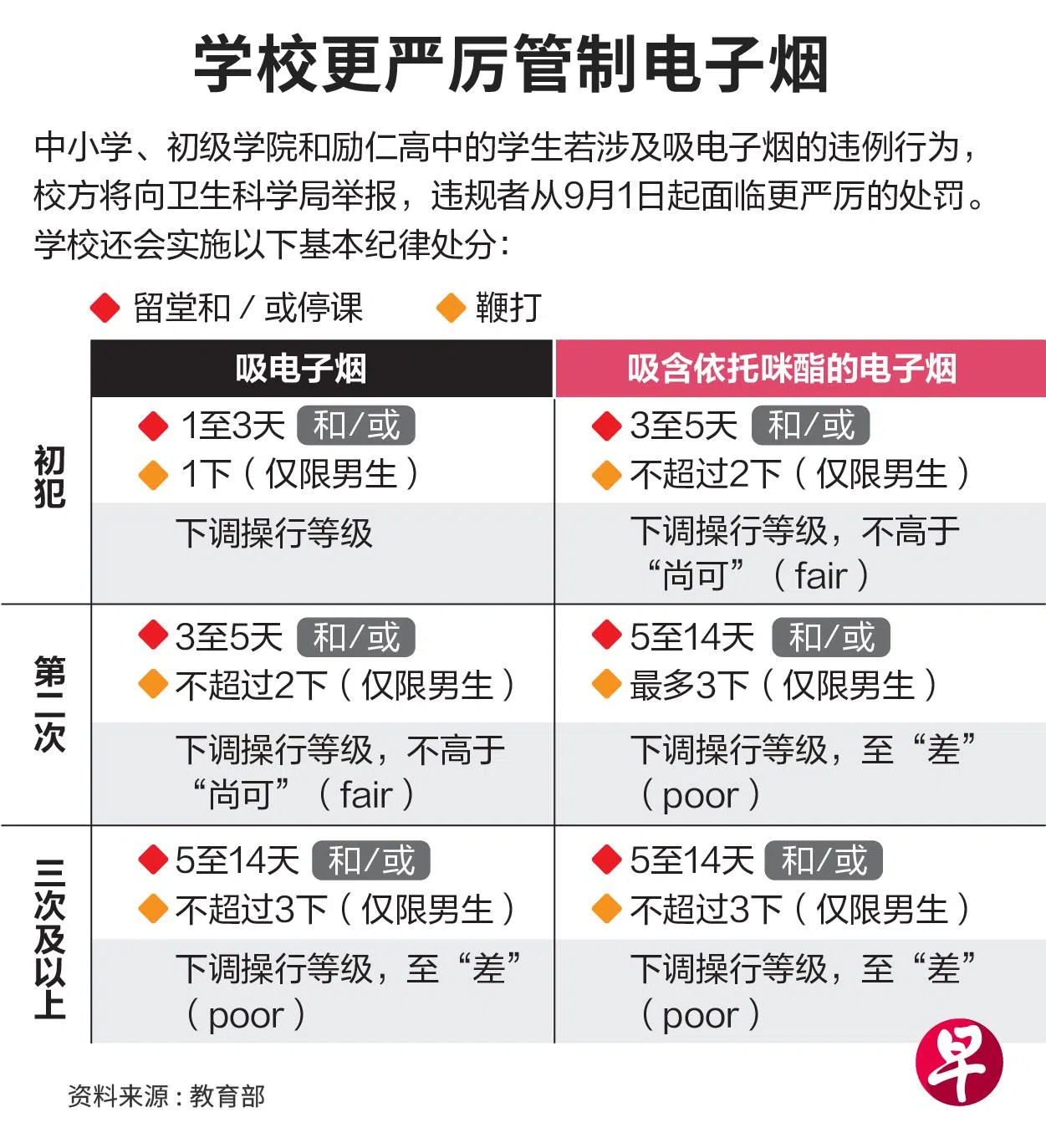 重犯三次或更多者,无论电子烟是否含依托咪酯,学生操行等级将下调至“差”,并得留堂或停课五天至14天,或两者兼施,男生还可被打鞭三下。