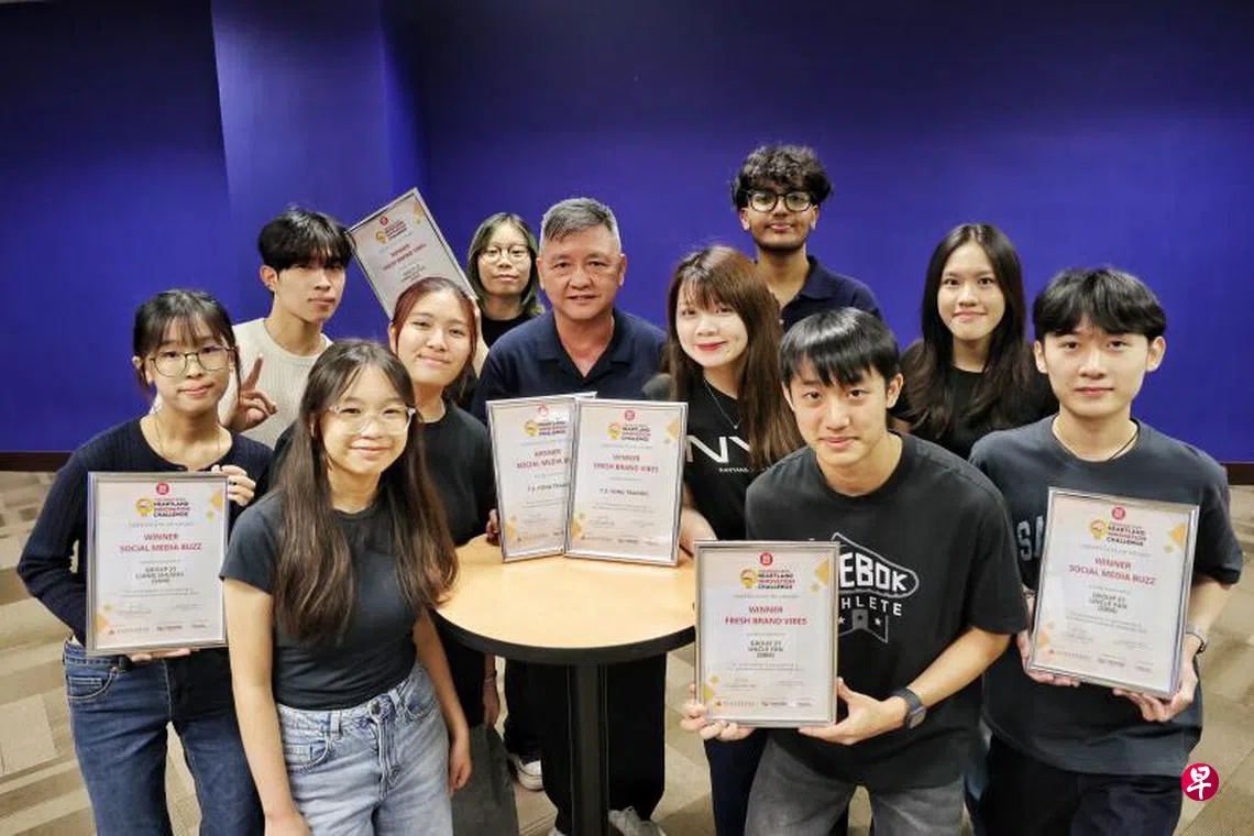 由新加坡全国商联总会主办的“邻里创新挑战2025”颁奖礼,星期五(8月29日)在南洋理工学院举行。南洋理工学院商业管理系和传播与动态设计系的28组学生与14家邻里商家配对,每个商家配对两组学生,根据商户的业务需求让学生制定方案。