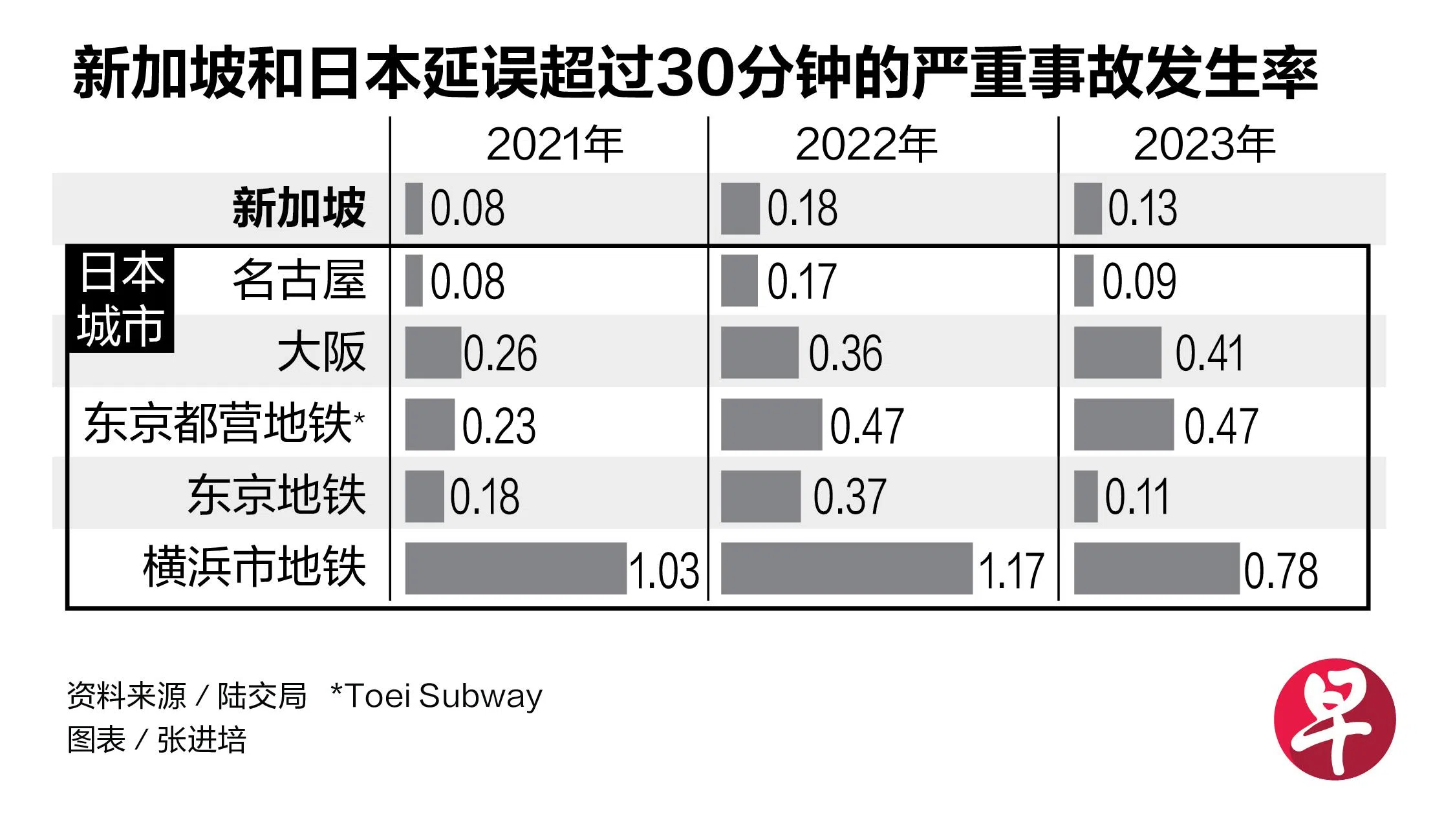 陆交局也在网站指出,世界其他地铁线侧重于记录更严重的故障事故。例如日本当局呈报的是延误超过30分钟的事故。若以这套标准来看,2023年新加坡地铁系统不及名古屋地铁,但比大阪、东京都营地铁(Toei Subway)及横浜市地铁可靠。