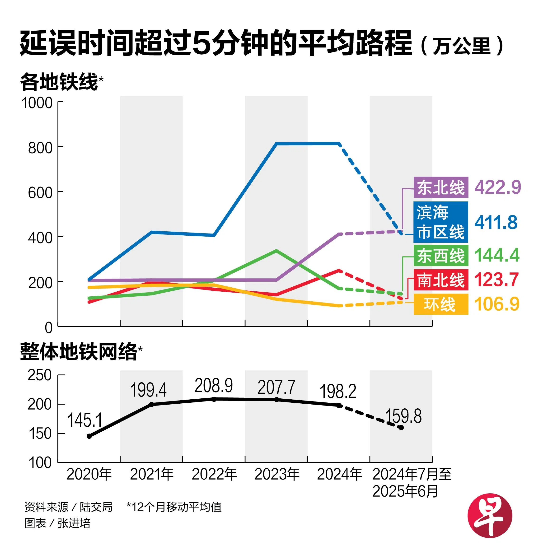 陆路交通管理局星期五(9月5日)在网站发布的最新数据显示,2024年7月至2025年6月间,整体地铁网络每行驶约159万8000公里,就发生一起延误超过五分钟的事故。去年每198万2000公里有一起;2022年和2023年分别达208万9000公里和207万7000公里。2020年则是145万1000公里。