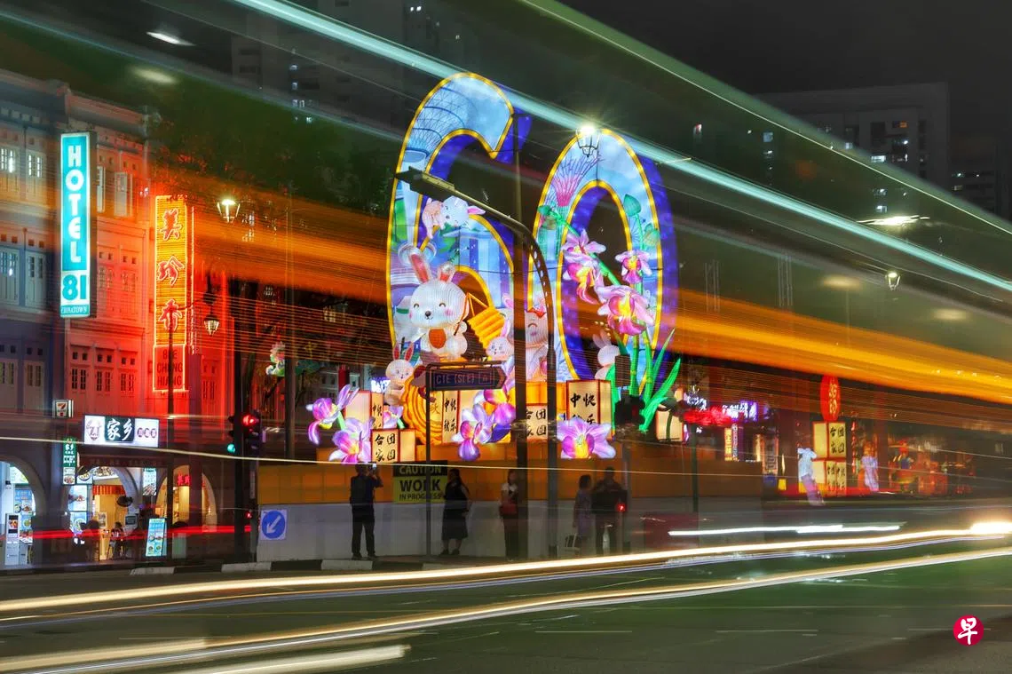 今年灯饰的主视觉高达八米,包括一组巨大数字“60”灯饰,以及环绕周围的玉兔、月饼、传统灯笼和胡姬花装饰,映衬新加坡的缤纷夜景。除了道路中央的巨型灯饰,唐城坊外墙也将点亮“SG”图样,延续这个装饰,共同献礼建国60周年。