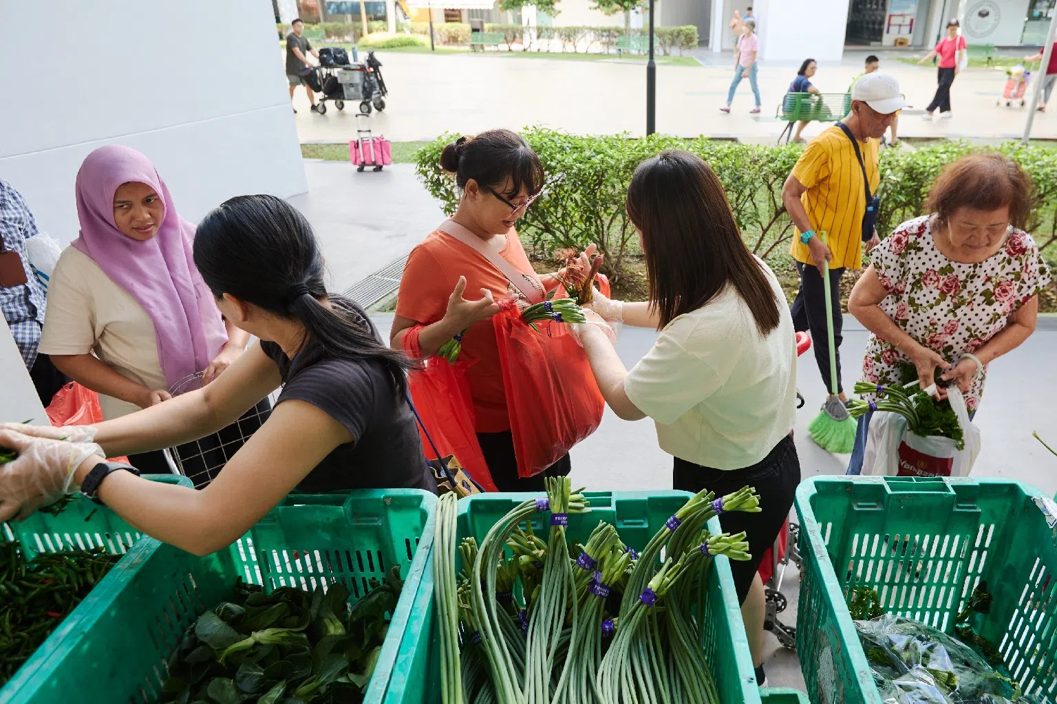 每到星期六,菜市路第43座组屋底层便热闹非凡。一边是义工们忙着从罗厘卸下一箱箱蔬菜,分拣后逐一包装;另一边则是居民们边聊天边排队,等候领取免费蔬菜。无论是给予帮助还是获得帮助的居民,大家打成一片,其乐融融。