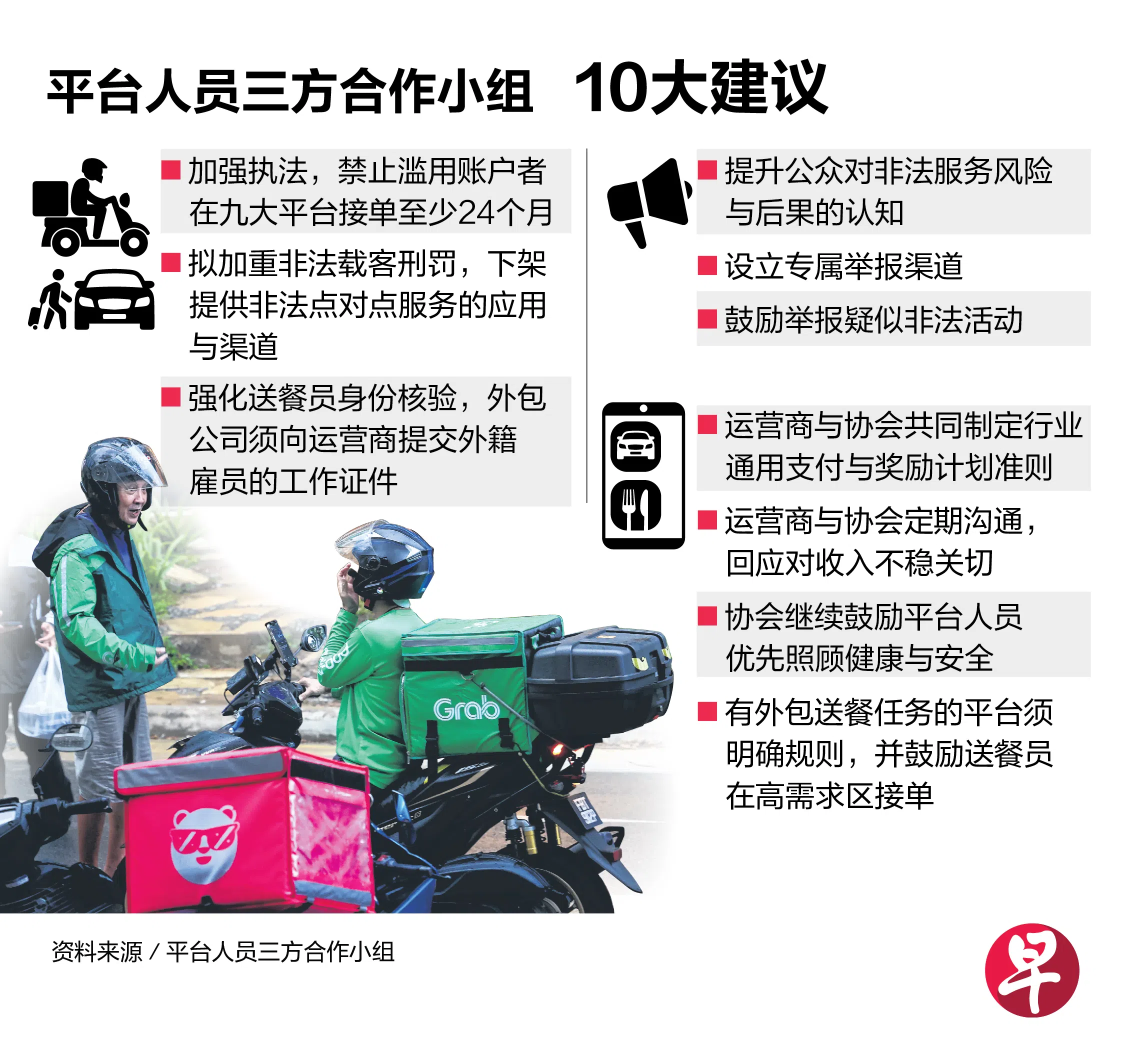 首六个建议聚焦加强执法和提高公众认知,例如鼓励平台人员和公众举报疑似非法行为;平台运营商若怀疑有平台人员让外籍人员使用个人账户接单,也应上报人力部。