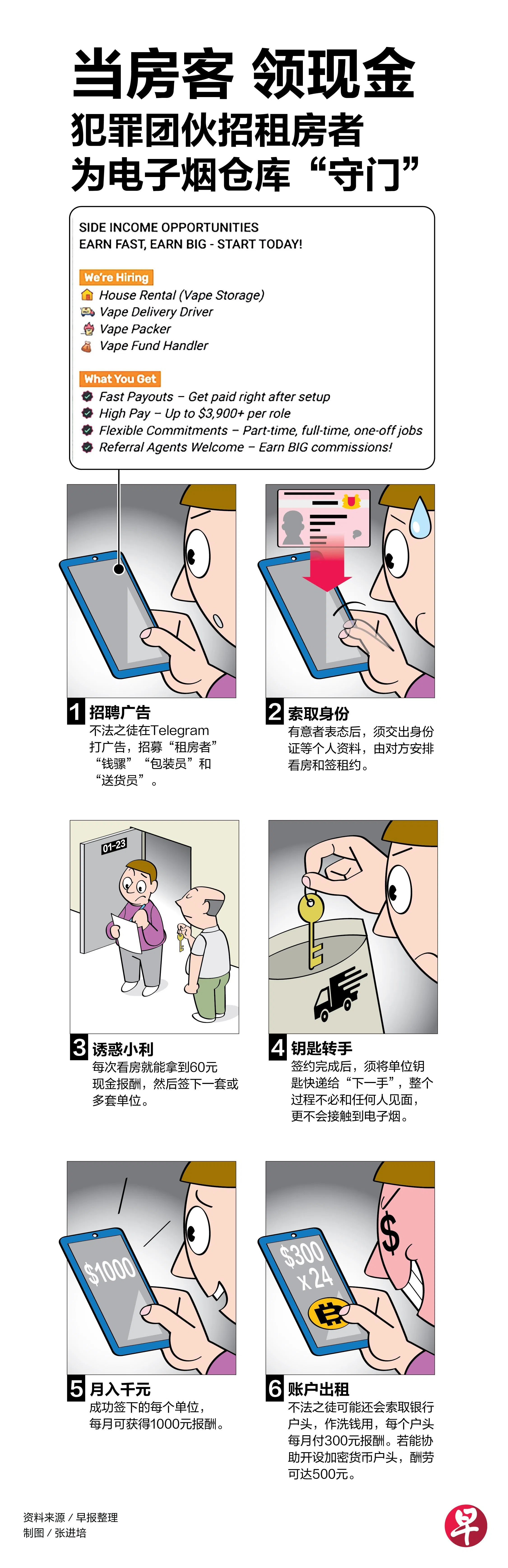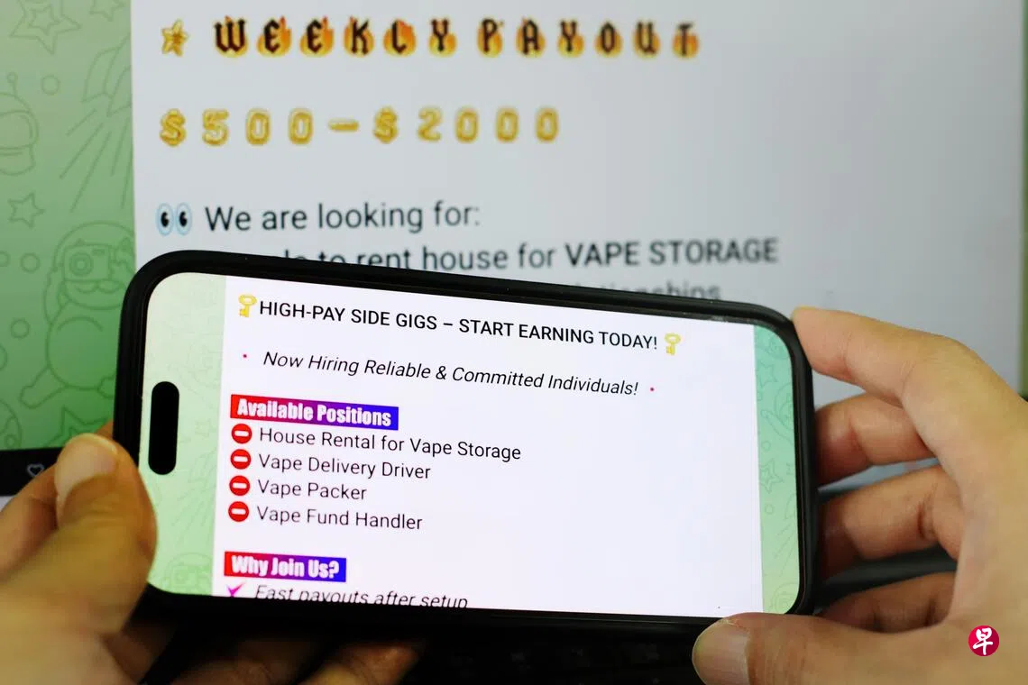 电子烟问题近年来持续引起关注,随着含有麻醉药依托咪酯(etomidate)的“丧尸烟弹”今年开始传开来,政府也自7月起进一步加强执法行动和处分。尽管如此,《联合早报》和《海峡时报》记者仍在Telegram和Instagram上,发现至少五则招聘广告,内容大同小异,都是要找人协助长期租下单位充当电子烟仓库、找“钱骡”帮忙转移赃款、找人手负责包装和派送。整个“招聘清单”俨然将非法生意明确分工。