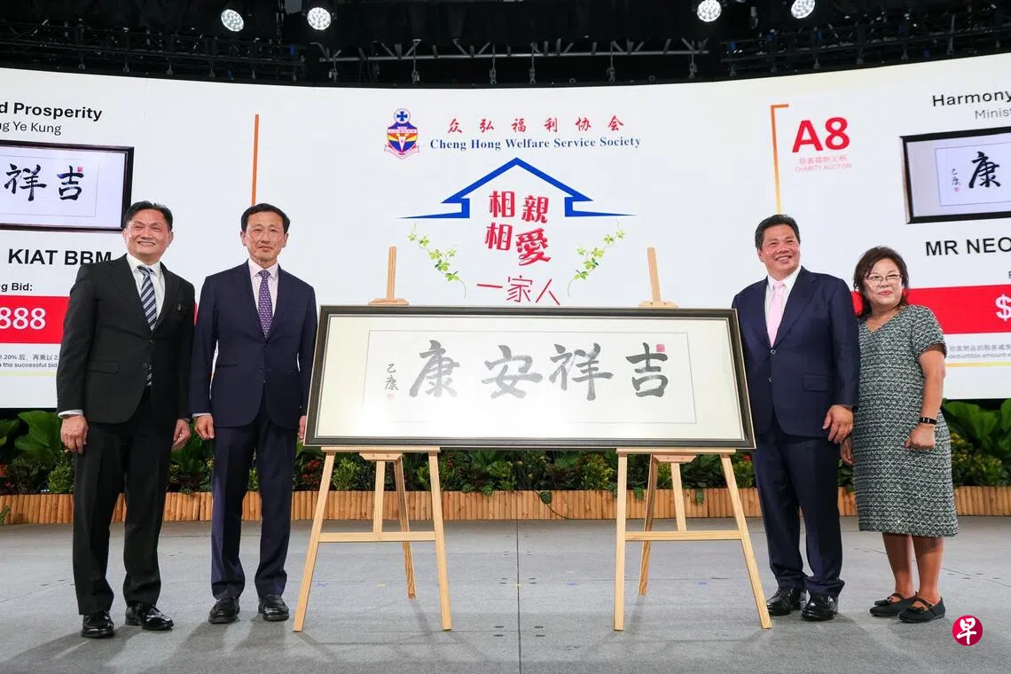 晚宴星期六(9月13日)在滨海湾金沙宴会厅举行,主宾是卫生部长王乙康,他为晚宴特别挥毫的一幅书法“吉祥安康”,由众弘永久名誉主席、梁苑集团创办人梁佳吉以25万8888元标得,为全场最高。