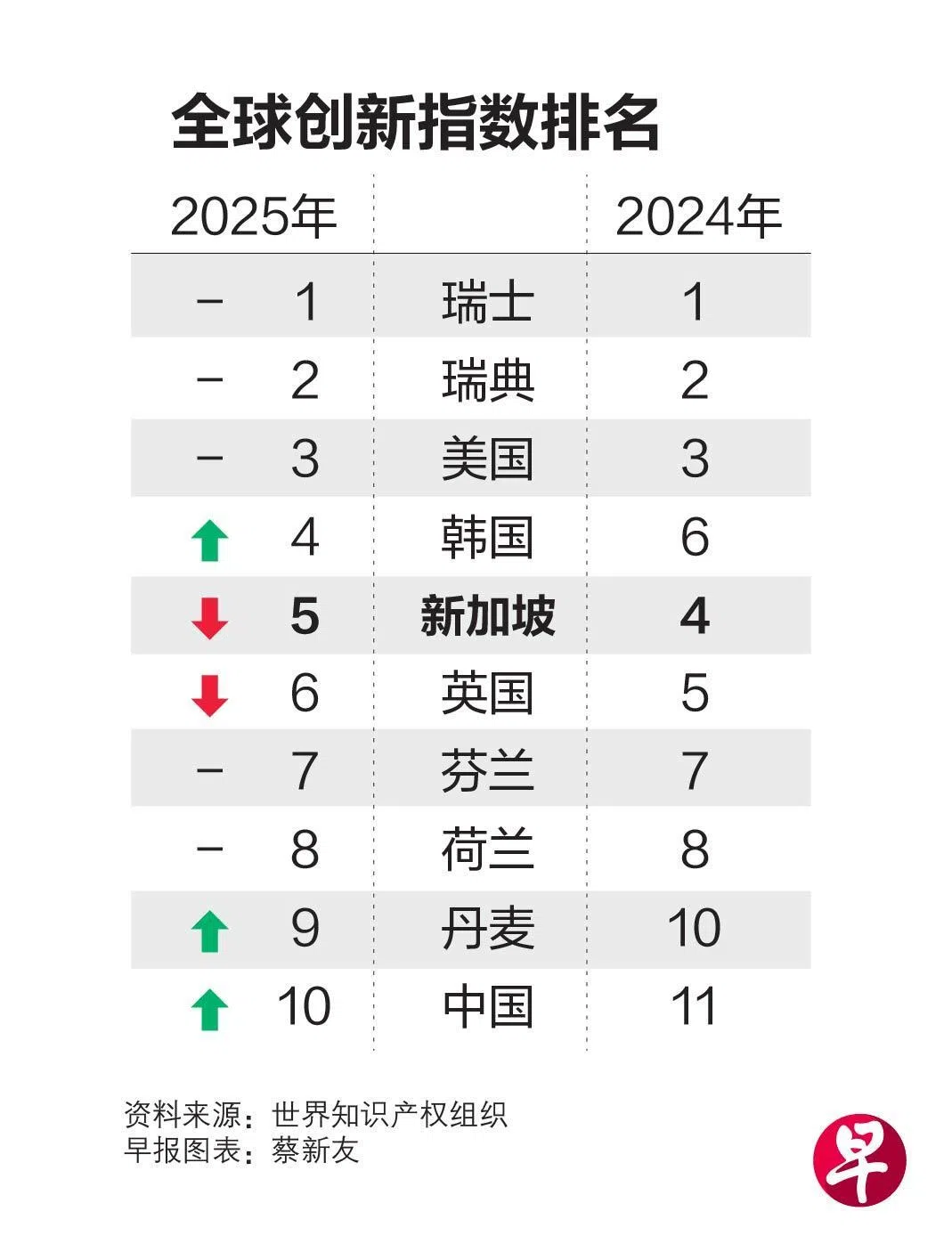 世界知识产权组织(World Intellectual Property Organisation,简称WIPO)星期二(9月16日)发布2025年全球创新指数(Global Innovation Index)。瑞士、瑞典和美国依旧依序拿下前三,韩国由去年的第六位,超越我国及英国,排名第四。中国则以全球中等收入经济体之姿,首次晋身10大,排在第10位。