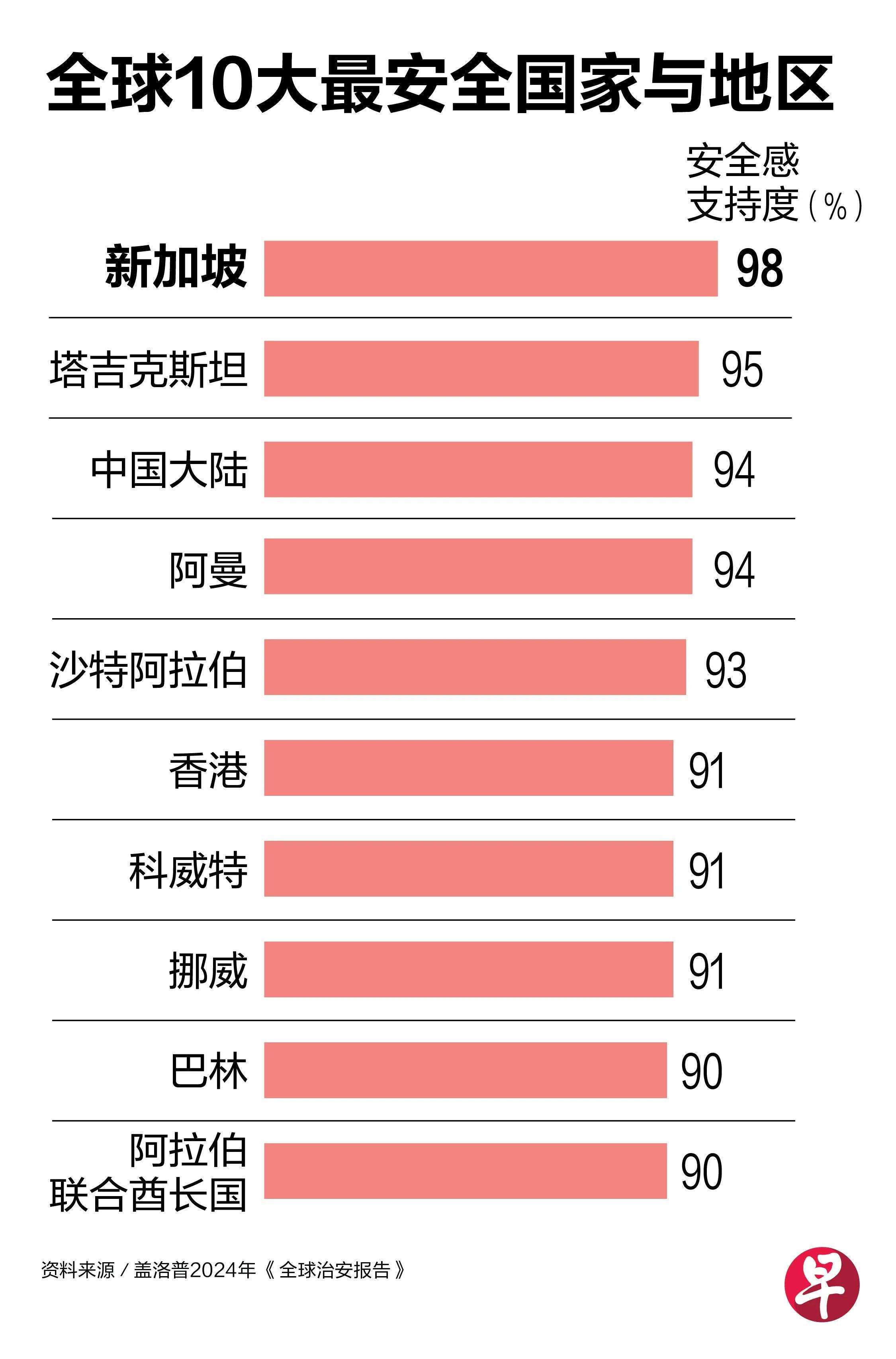 民意调查公司盖洛普发布的2024年《全球治安报告》(Global Safety Report)显示,98%本地受访者认为晚上独自在街上行走是安全的,这也是新加坡自2006年以来,第12次获评选为全球最安全的国家。