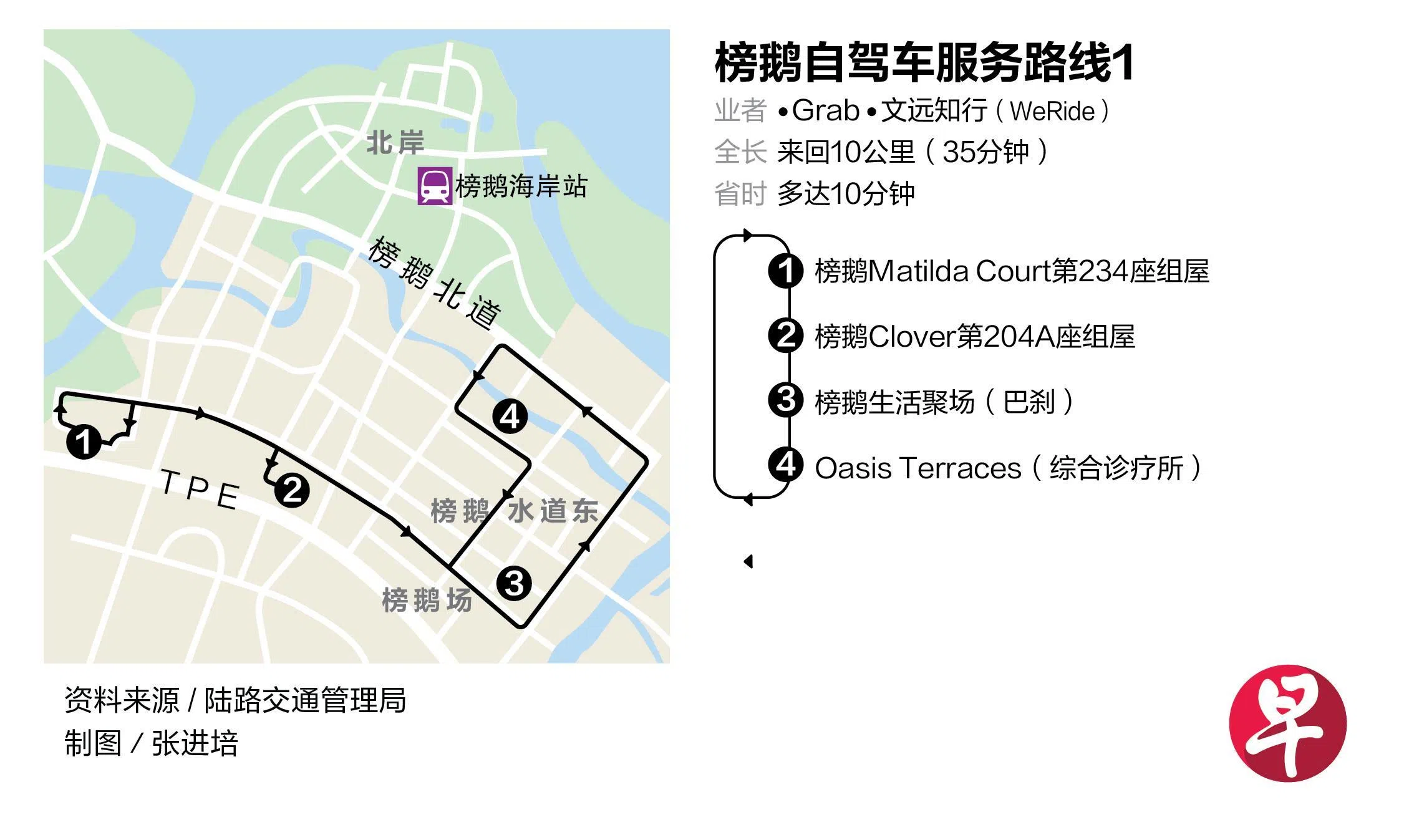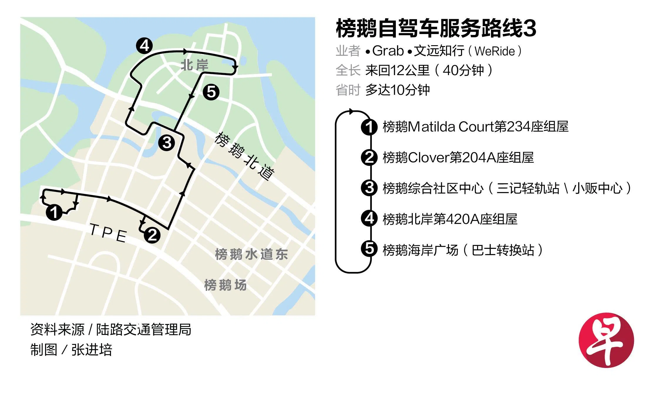 第三条路线同样由Grab负责,来回路程为12公里,车程为40分钟。住在榜鹅Matilda Court和Clover的居民可以更便捷地抵达榜鹅海岸地铁站和巴士转换站,以及榜鹅综合社区中心,省下多达10分钟通行时间。