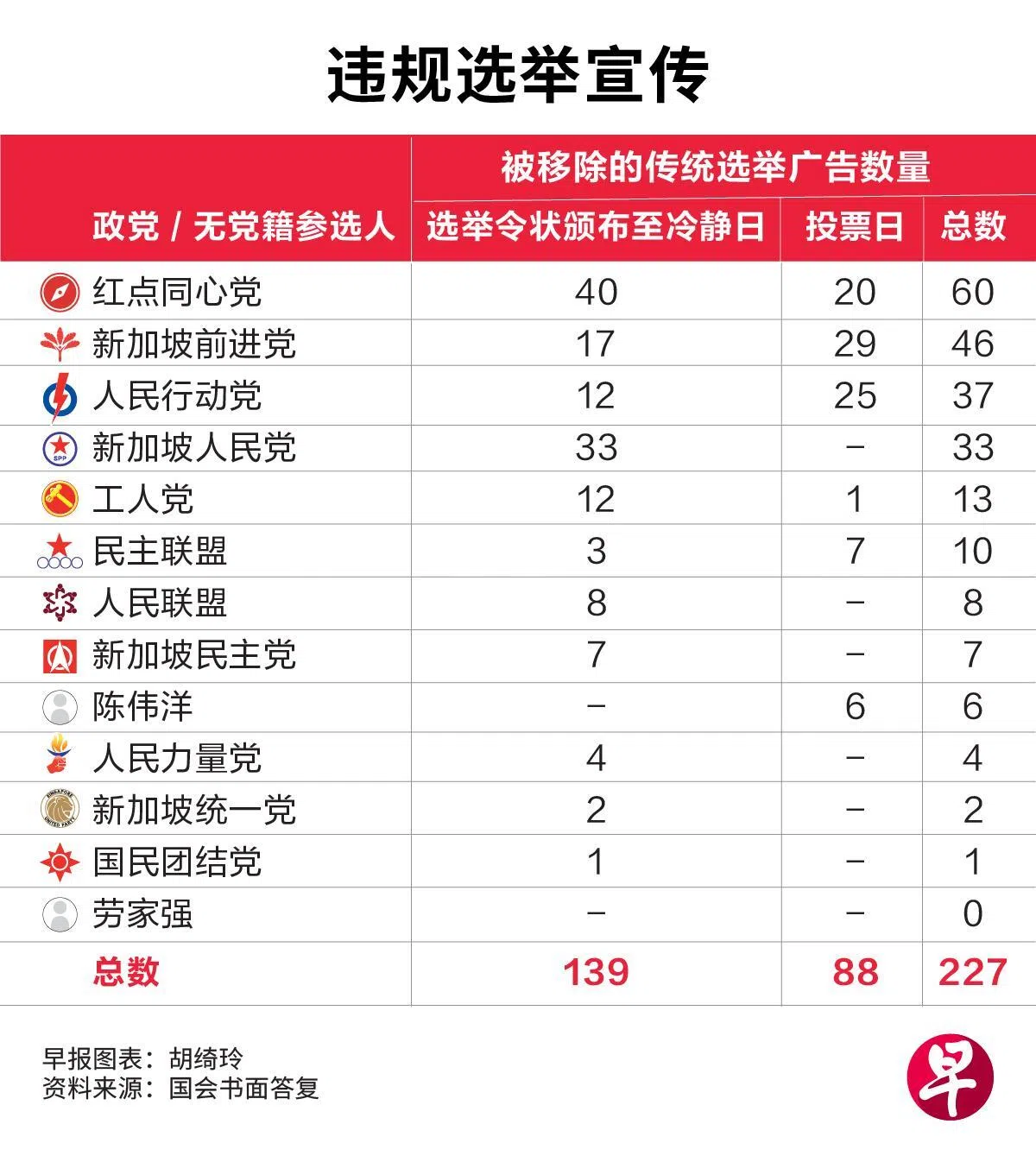 红点同心党共有60个广告须移除,是所有政党中最多的。其他依序是:新加坡前进党46个、人民行动党37个、新加坡人民党33个、工人党13个。