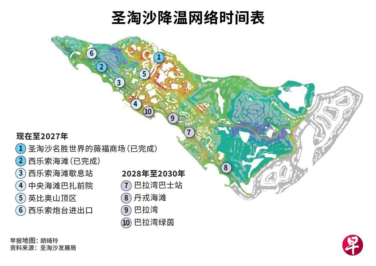 为进一步降温,圣淘沙计划创建“降温网络”,到了2030年在10个地点和地区推出降温措施。当局目前已完成在圣淘沙名胜世界的薇福商场(Weave)和西乐索海滩的部署工作。