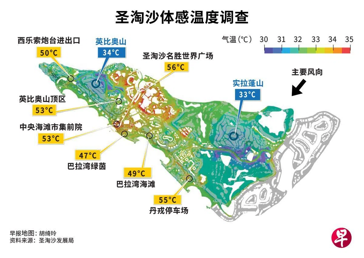 不过,研究团队把湿度、风速、太阳辐射等环境参数考虑在内后发现, 在英比奥山顶区、中央海滩市集前院和圣淘沙名胜世界广场等地段,访客的体感温度可能超过50摄氏度。