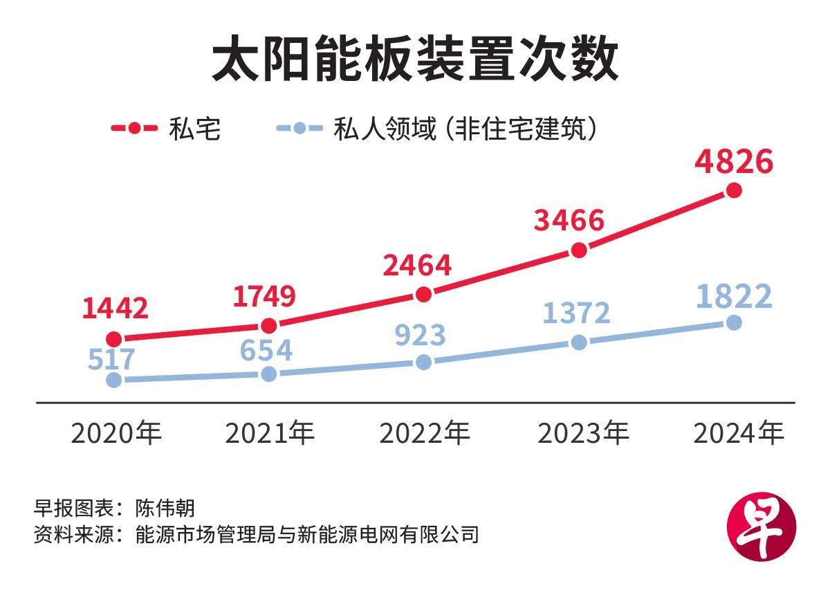 根据能源市场管理局与新能源电网有限公司的数据,私宅太阳能板装置的数量逐年递增,2020年有1442个,2021年1749个,2022年2464个,2023年3466个,2024年增至4826个。这些数据9月底在国会书面答复中提及。