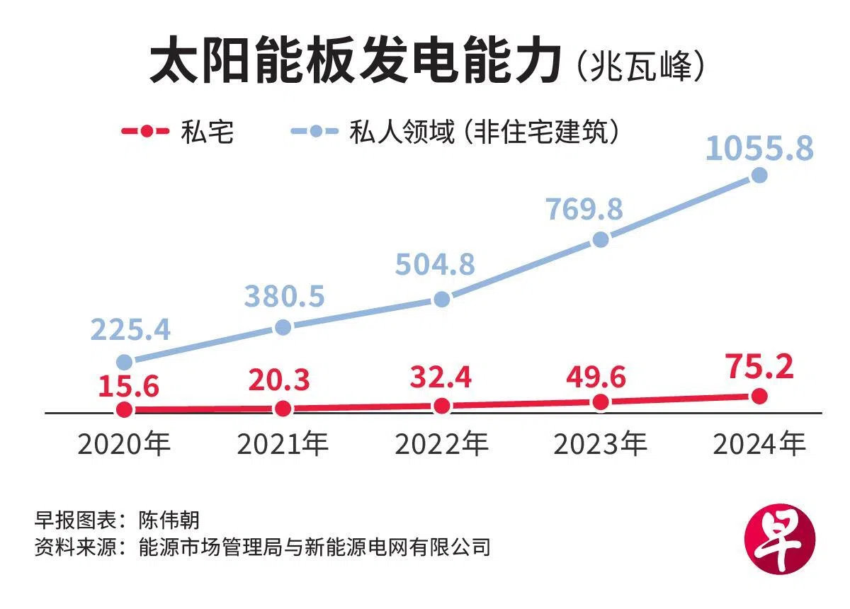 这些非住宅太阳能板装置的发电能力也大幅增强,从2020年的225.4兆瓦峰,升至2024年的1055.8兆瓦峰。