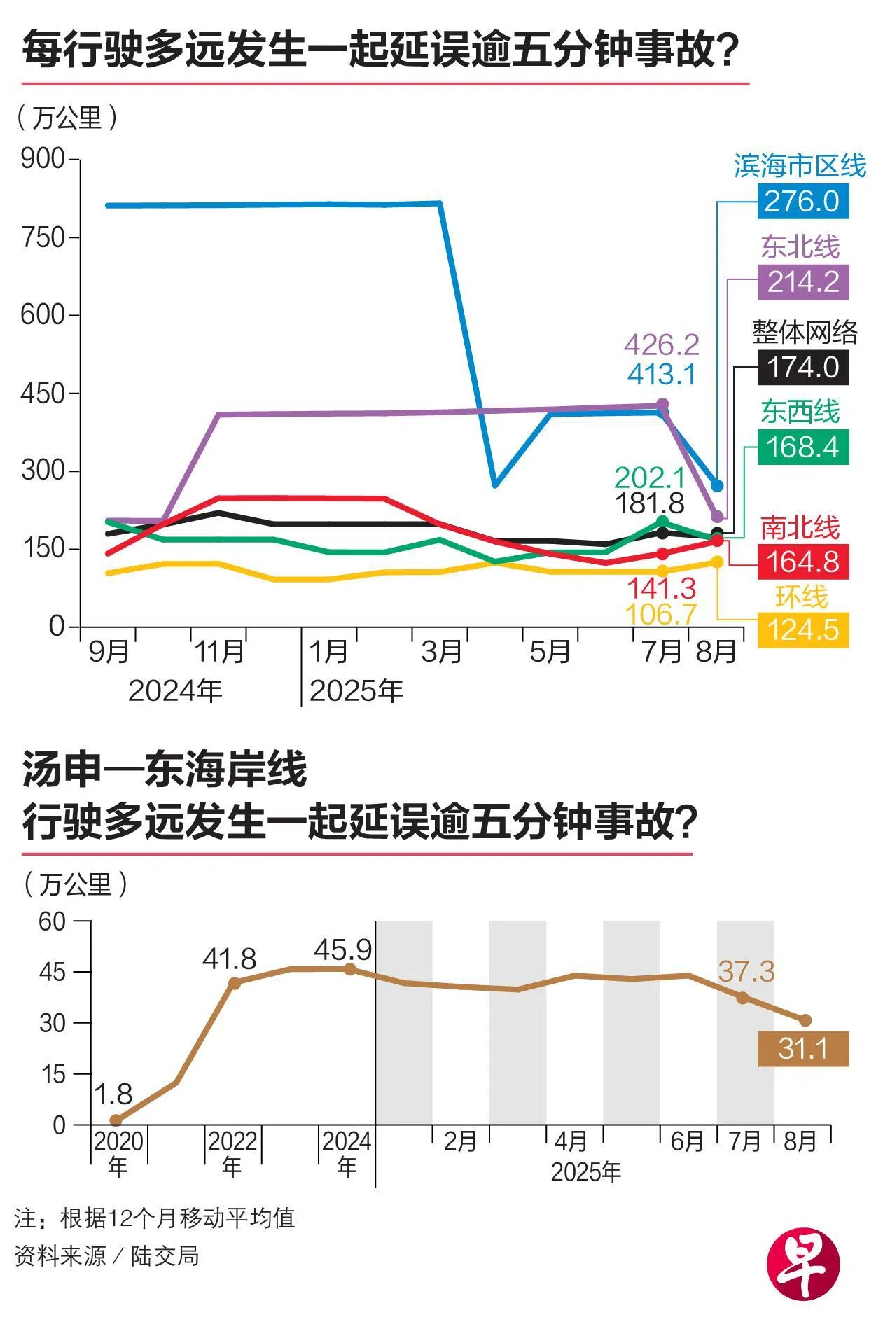 截至8月,汤东线每行驶31万1000公里发生一起延误超过五分钟的事故,不如2024年的45万9000公里,但比2020年通车第一年的1万8000公里好。